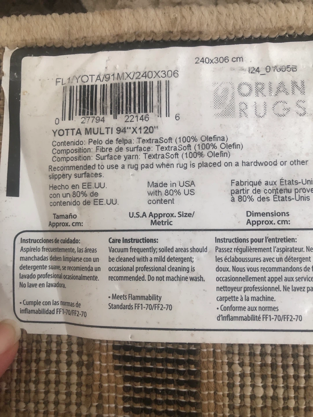 This ORIAN RUGS YOTTA MULTI rug is made with 100% Olefin surface fiber. It's made in the USA with 80% US content. Vacuum frequently and spot clean soiled areas with a mild detergent.
