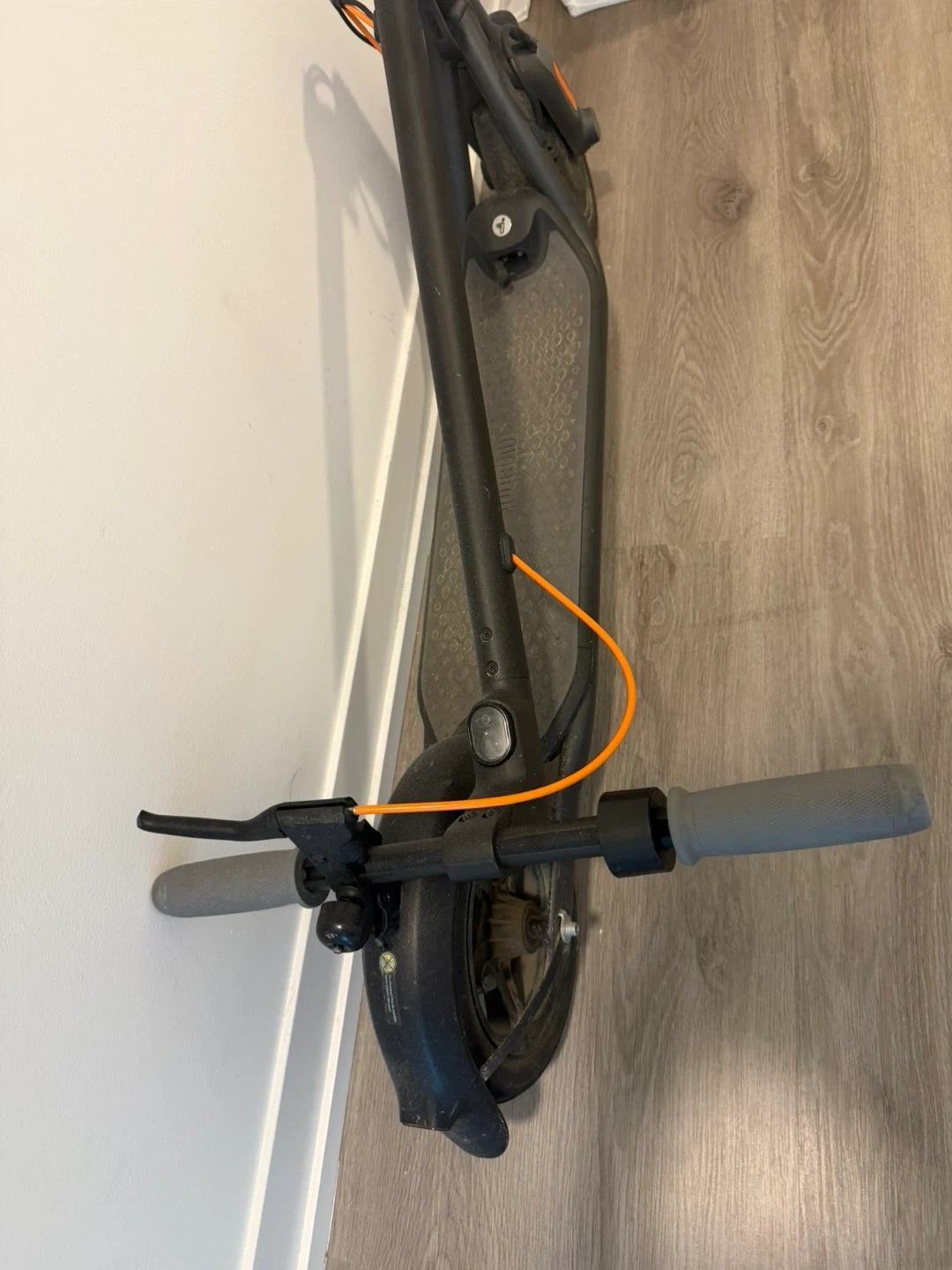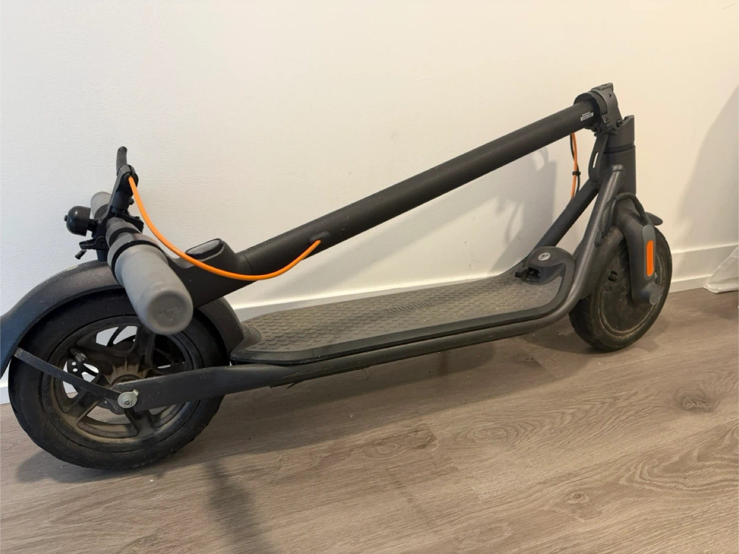 Segway Ninebot ES2 electric scooter in black. It's in used condition with some scuffs. The scooter is foldable for easy storage and transport. It's great for getting around town!