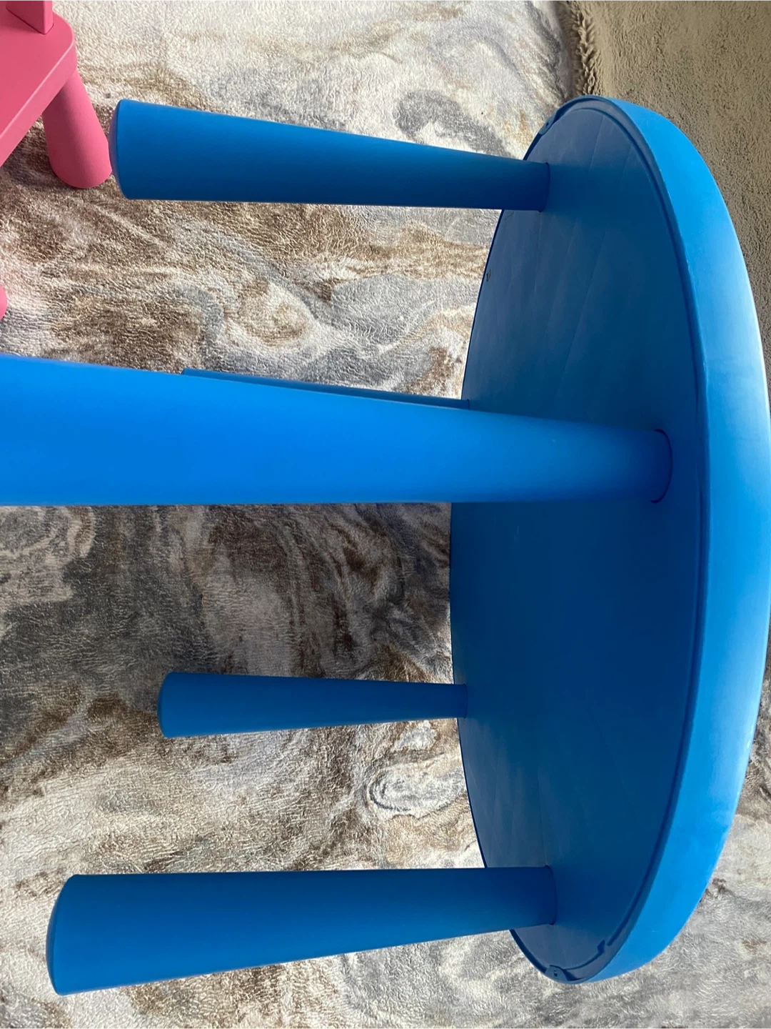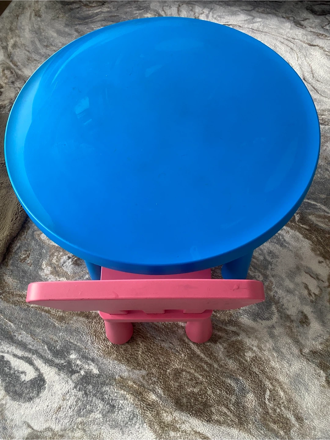 This is a blue IKEA Mammut table and a pink chair set for kids. It's made of durable plastic and perfect for playtime or crafts. The table has colourful stickers around the edge.