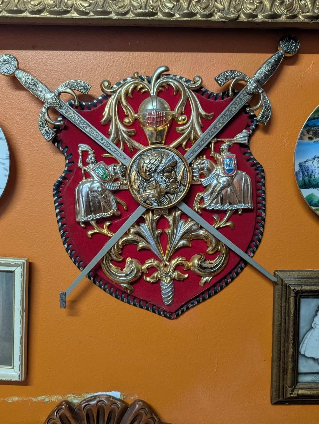 Here's a cool decorative sword and shield wall hanging! It's got a red shield with gold accents and crossed swords. Adds a unique touch to any room!