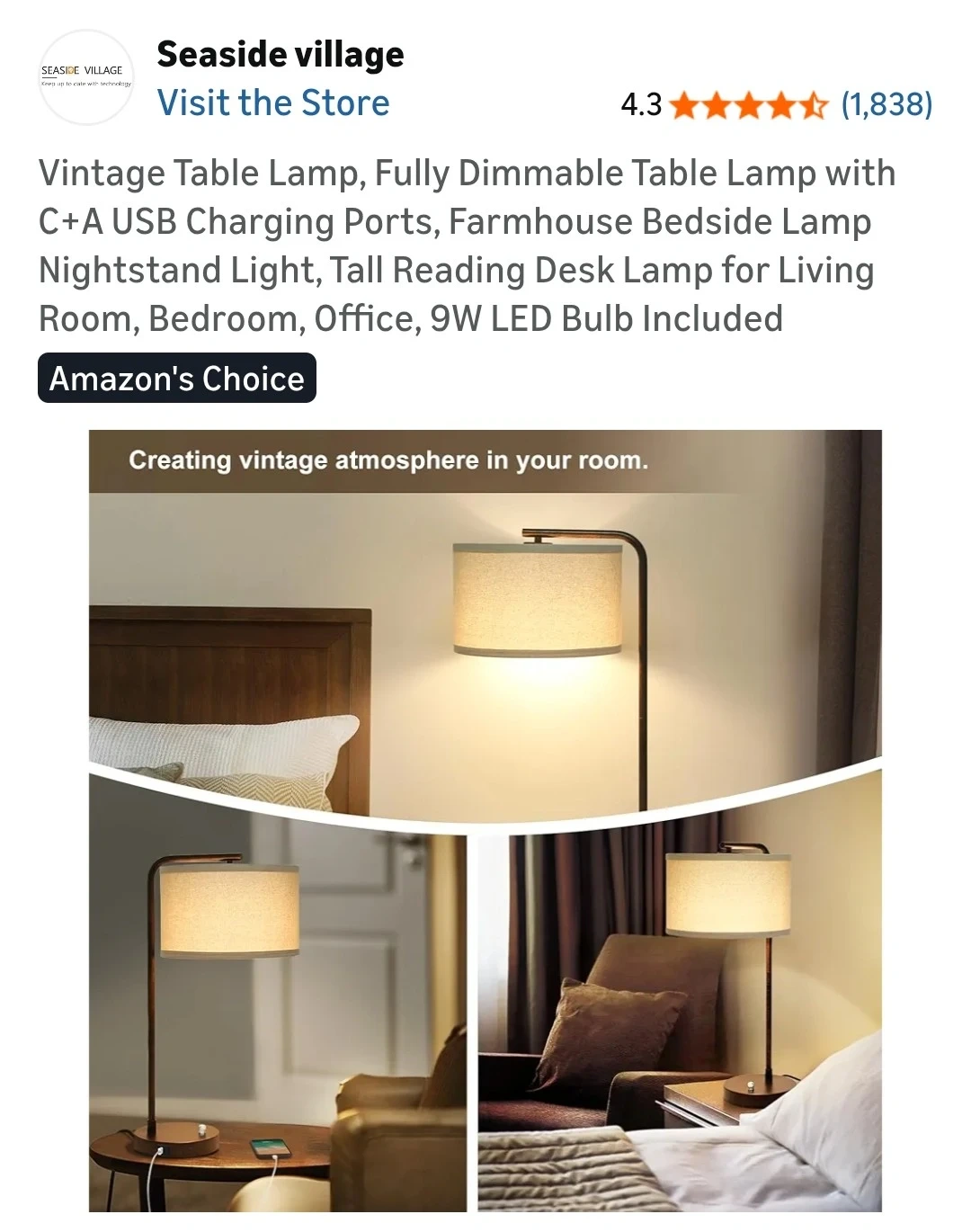 Vintage Table Lamp, Fully Dimmable Table Lamp with C+A USB Charging Ports, Farmhouse Bedside Lamp Nightstand Light, Tall Reading Desk Lamp for Living Room, Bedroom, Office, 9W LED Bulb Included