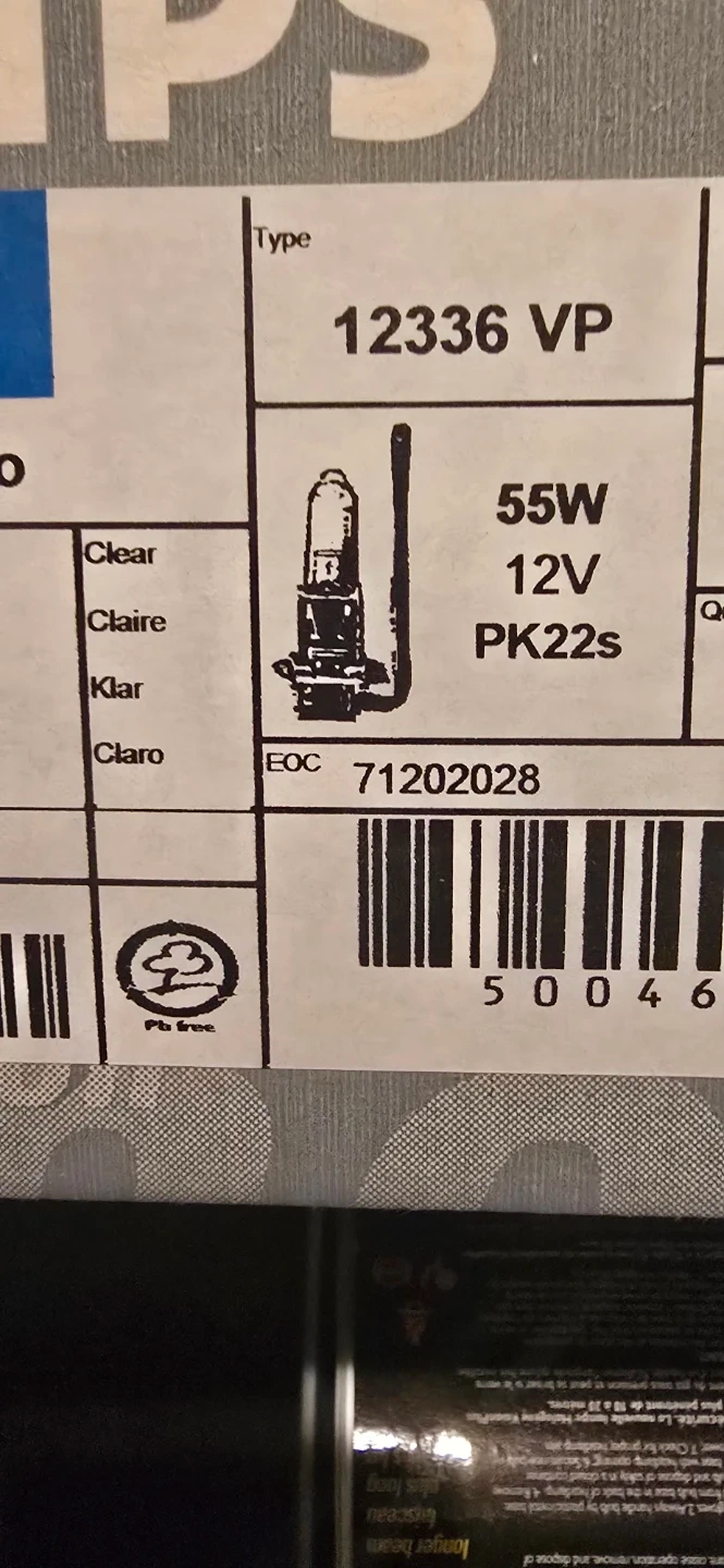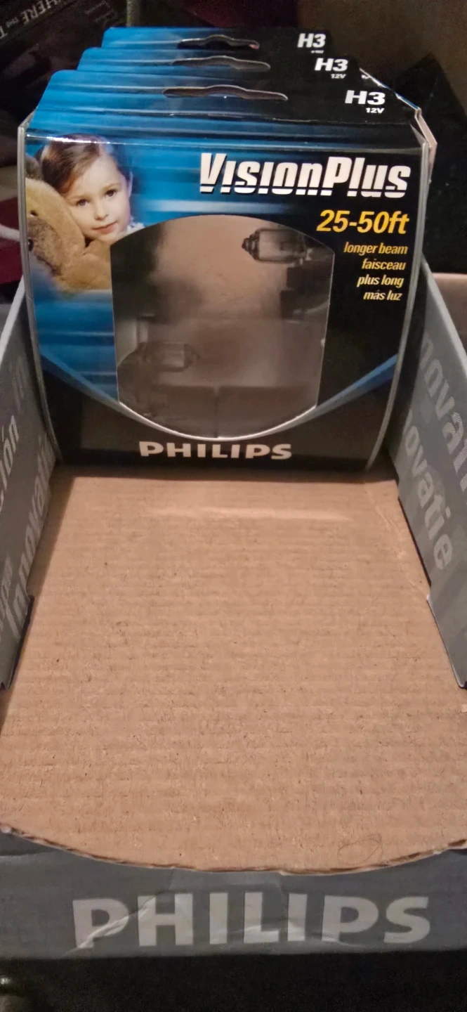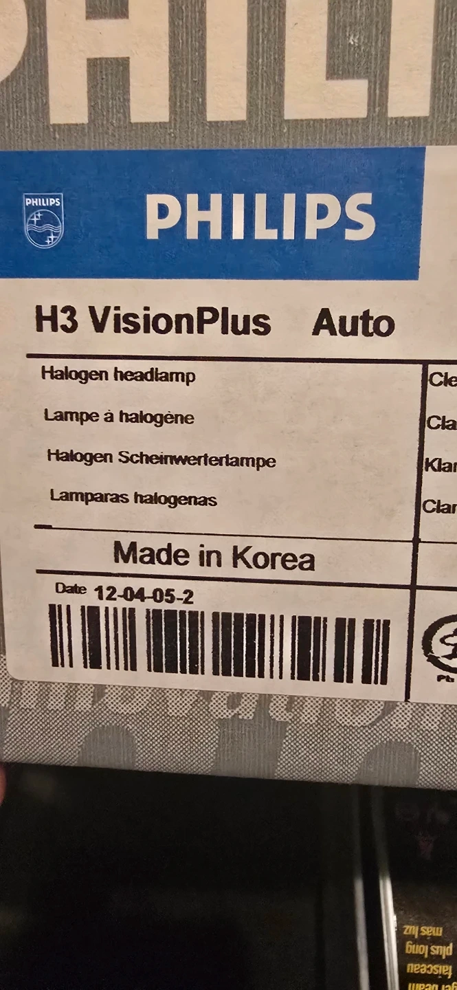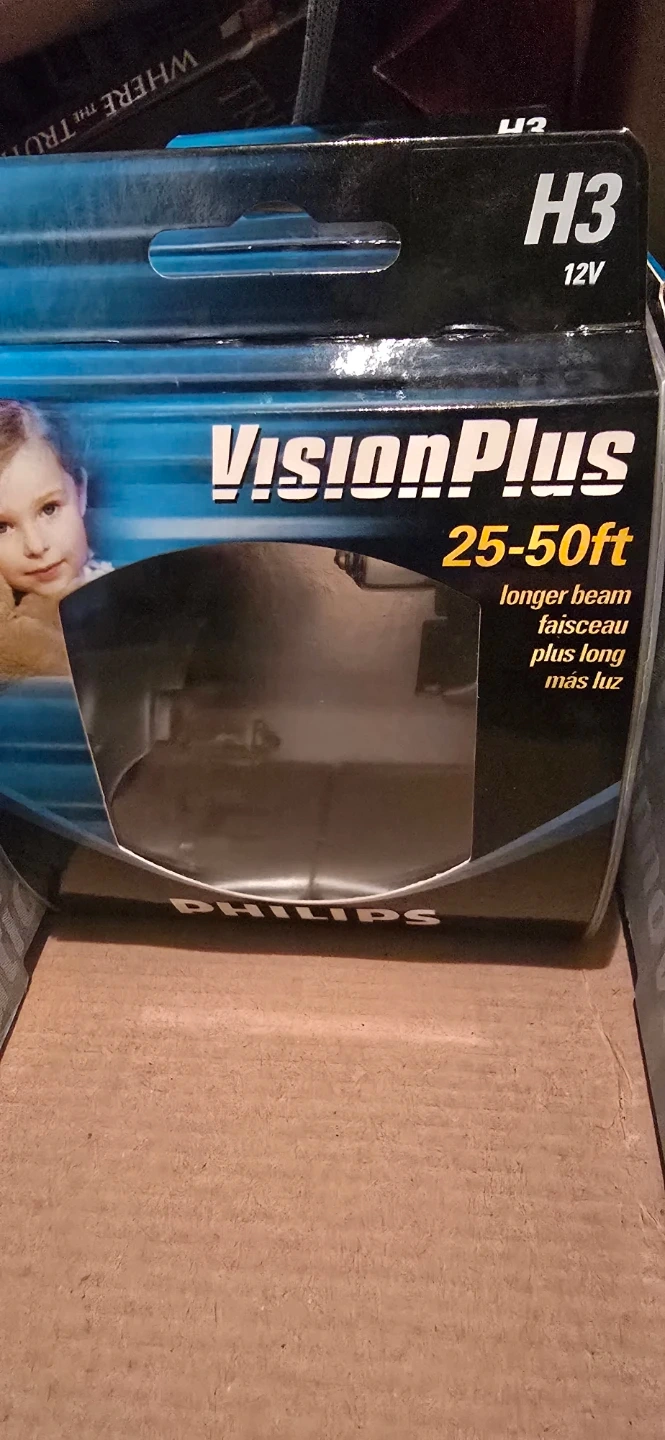 Philips VisionPlus H3 halogen headlamp bulb. It's a 55W, 12V bulb designed for a longer beam, providing 25-50ft of light. Made in Korea.