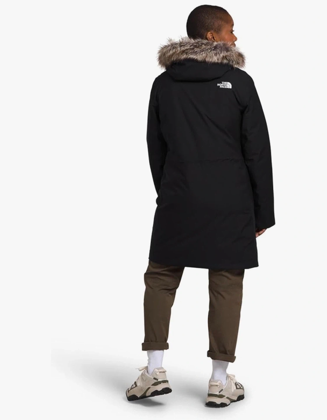 This black parka from The North Face offers excellent warmth and style. It features a full zip closure, adjustable waist drawcords, and a cozy faux fur-lined hood. It's great for staying comfortable during colder months!