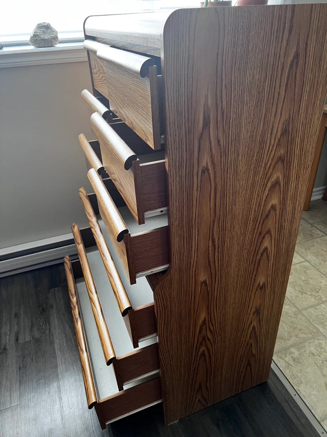 A piece of iconic design. This golden oak dresser features a striking waterfall silhouette and built-in sculpted handles for a clean, architectural look.