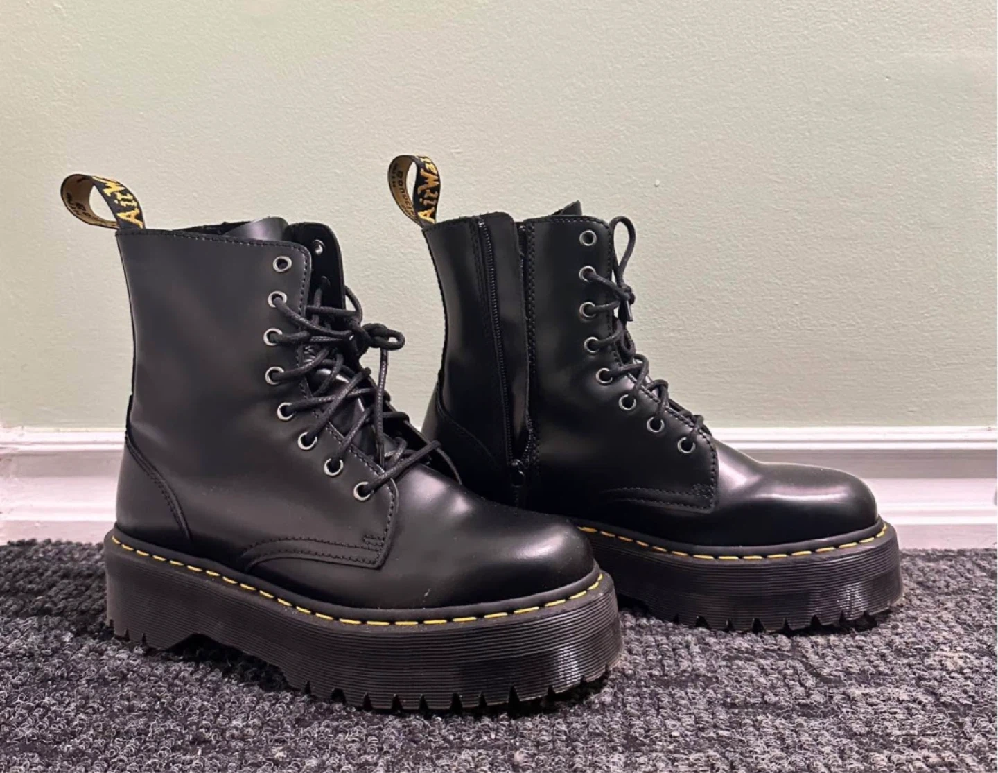 Dr. Martens JADON boots in black polished smooth leather. UK size 7 (EU 41, US Women's 9). Features the signature platform sole and yellow stitching