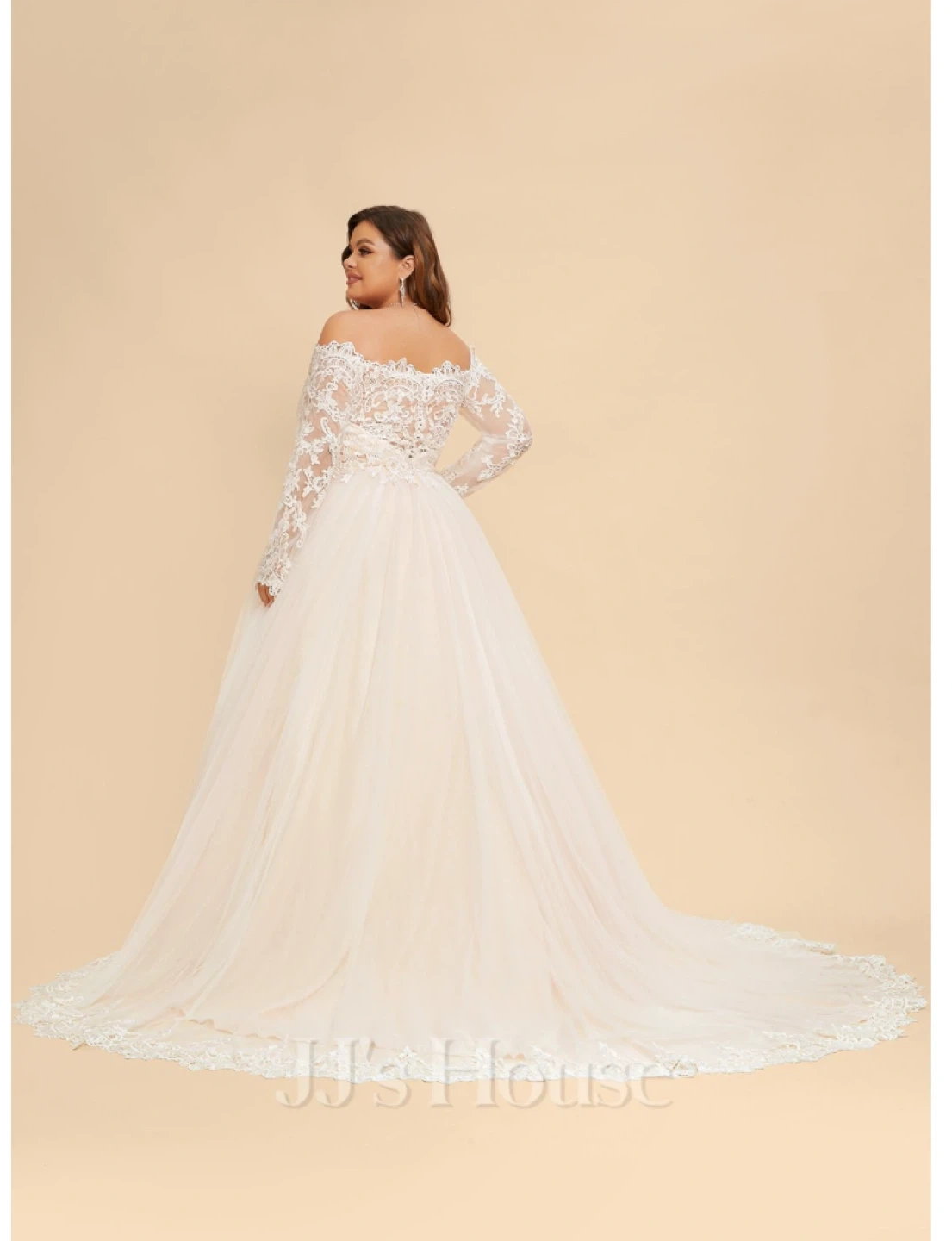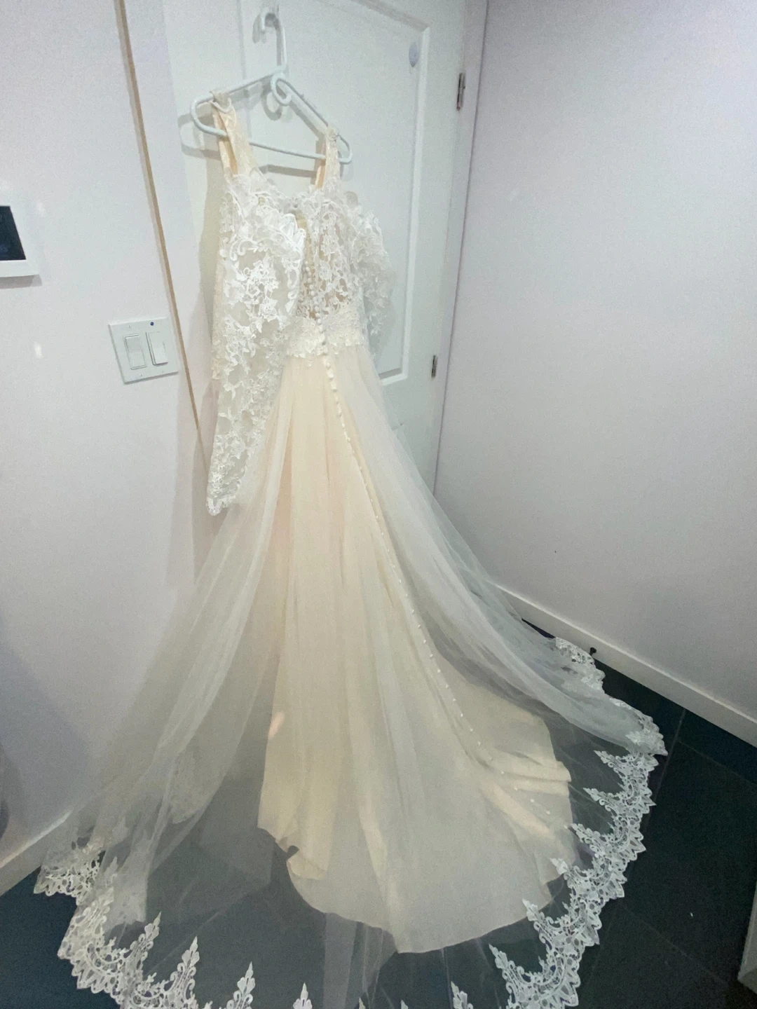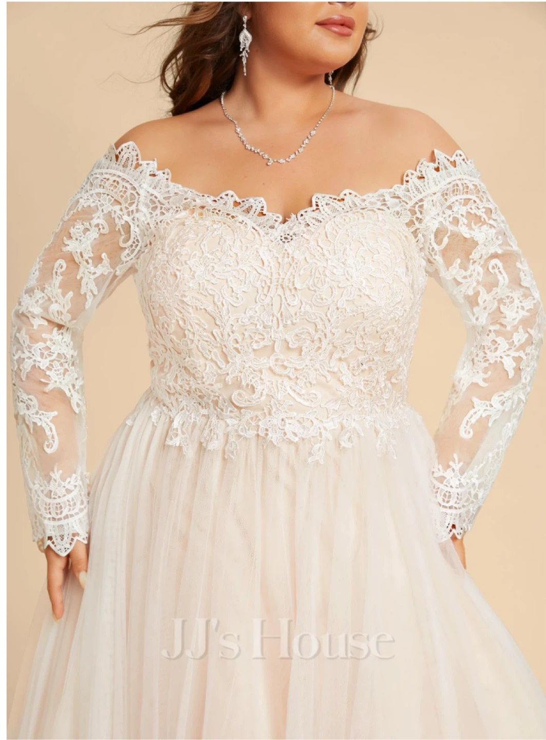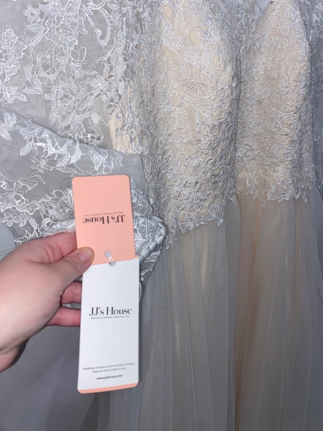 Selling a beautiful JJ's House wedding dress. It features delicate lace detailing on the bodice and sleeves, with a flowing tulle skirt. The dress has an off-the-shoulder design and button detailing down the back. It's in great condition and ready for its special day!