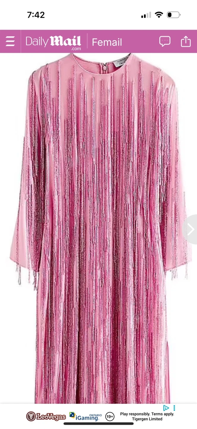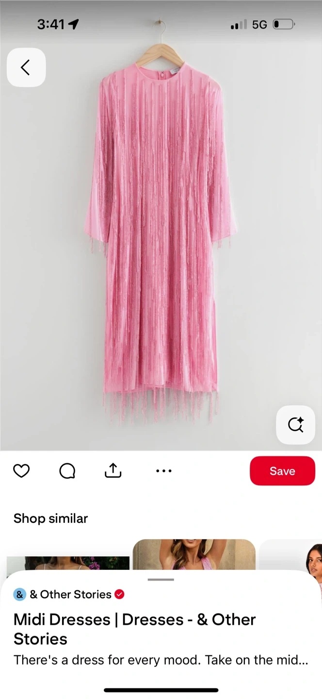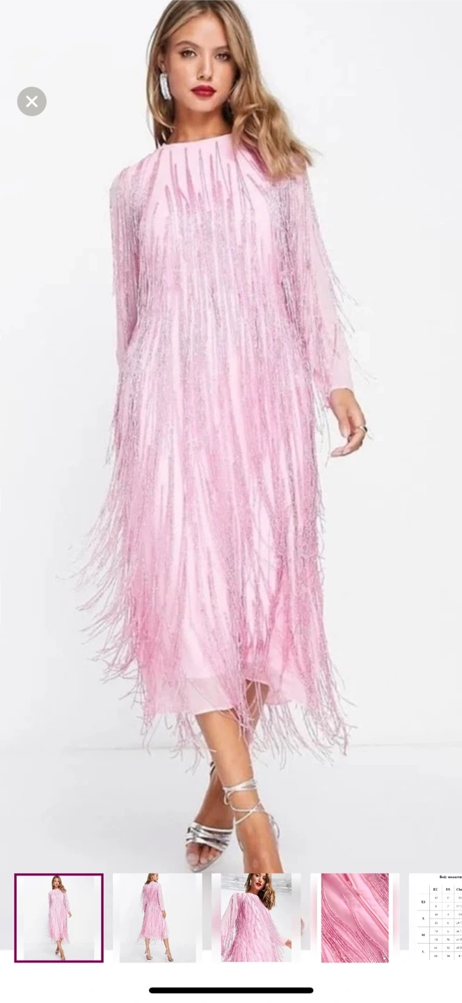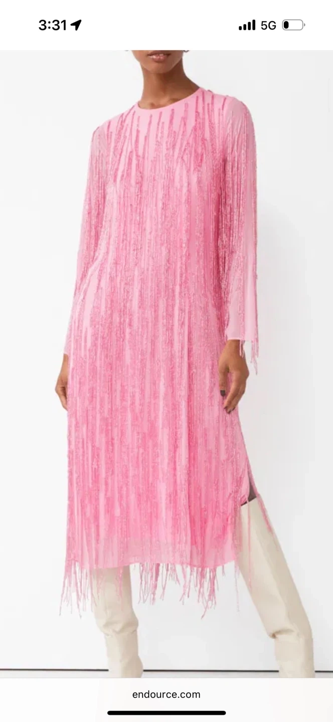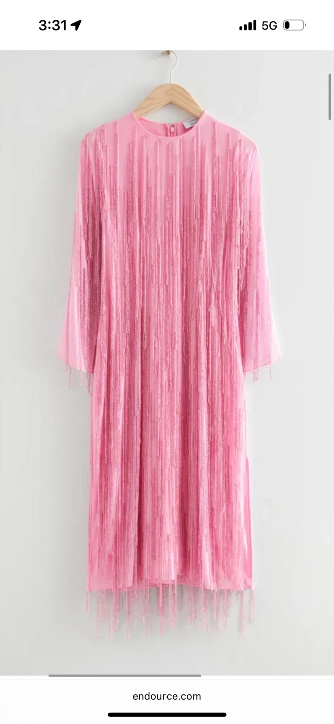 Selling a beautiful pink fringe midi dress from & Other Stories! It's perfect for a special occasion or a night out. The dress features long sleeves and a unique fringe detail that adds a touch of elegance and fun
