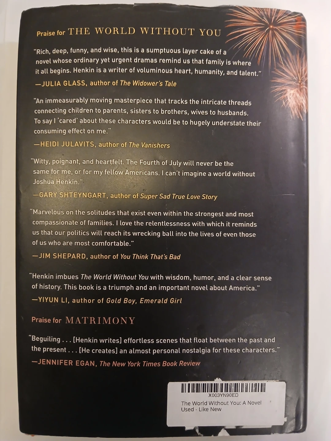 This is a paperback novel titled 'The World Without You' by Joshua Henkin. It's a story about family and the Fourth of July. The book is in good condition.