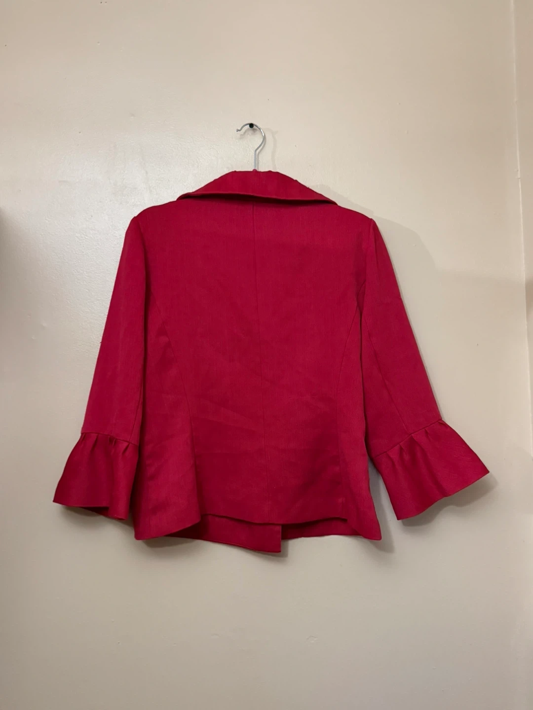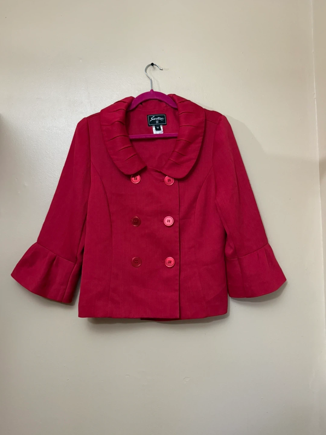 This is an elegant red blazer in size 10, featuring a double-breasted button closure and stylish bell sleeves. The blazer is in good condition, showing gentle signs of wear.