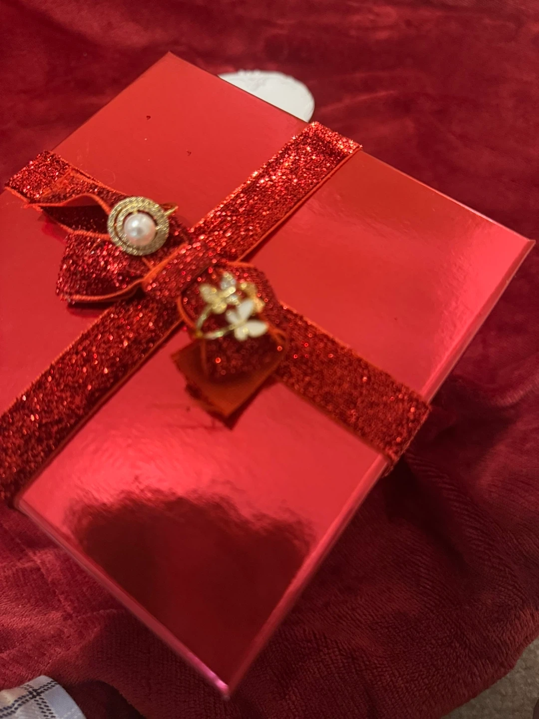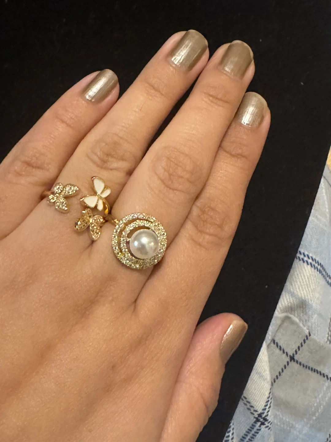 A beautiful set of two gold-tone rings. One features a pearl surrounded by sparkling stones, and the other has dainty butterfly charms. They're perfect for adding a touch of elegance to any outfit.BUTTERFLY RING ONE LEFT✨