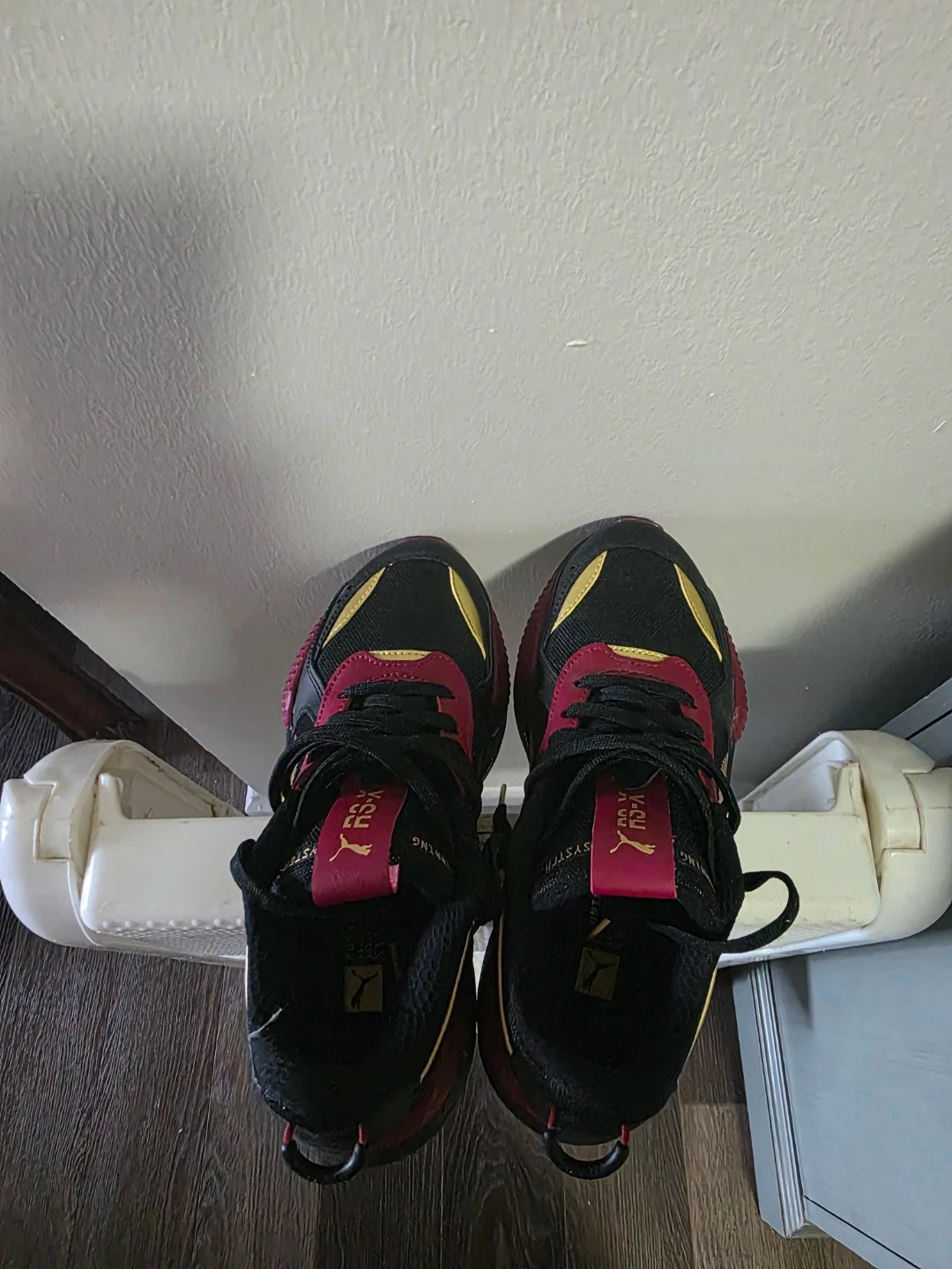 These Puma RS-X shoes are a stylish black, red, and gold colourway. They're designed for comfort and performance. The RS-X line often features a bulky silhouette with layered materials.