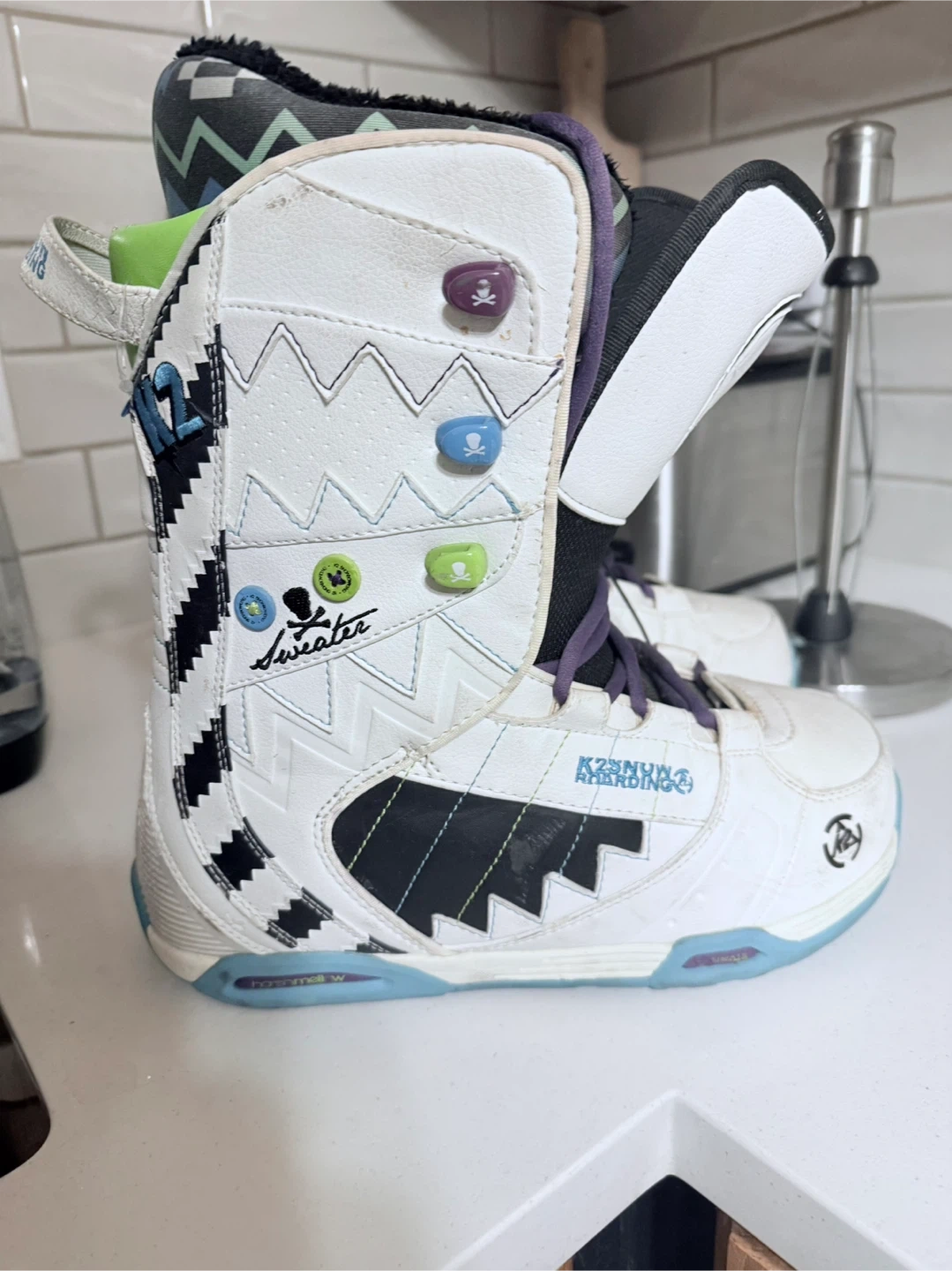 Beautiful K2 Darko snowboard boots in white with purple laces. Model is Darko, size is US 10.5 (EUR 44, These boots offer a comfortable fit for hitting the slopes.