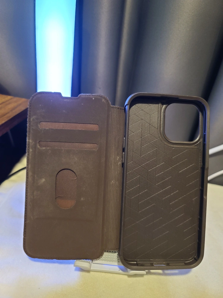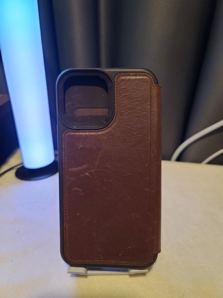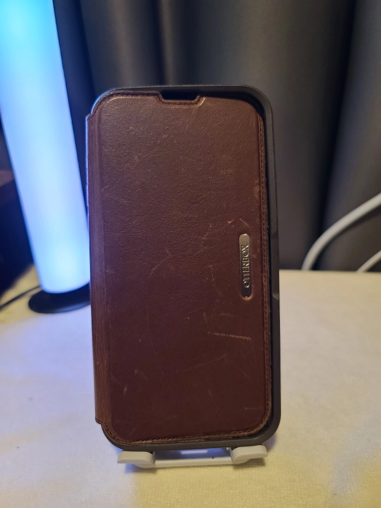 Selling a brown Otterbox iPhone case. It's in good condition and provides great protection for your phone. Has a wallet-style design with slots for cards or cash. Ready for a new home!