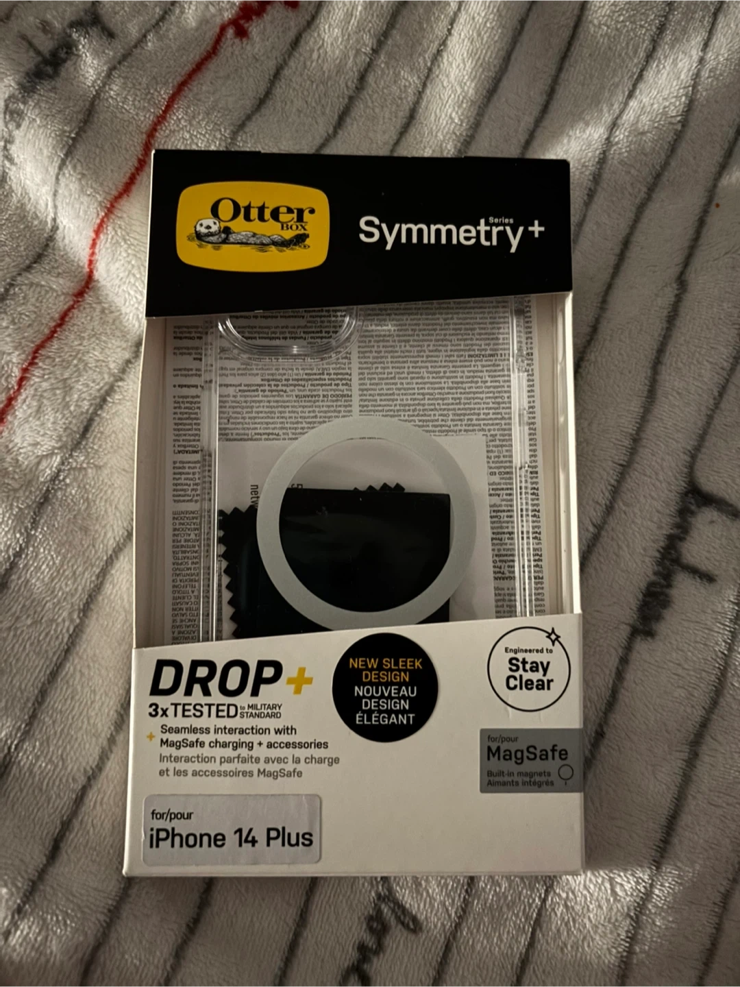 105Selling a clear OtterBox Symmetry+ case for the iPhone 14 Plus! It features a sleek design and seamless interaction with MagSafe charging and accessories. The case is drop tested to 3X military standard and has built-in magnets to stay clear!