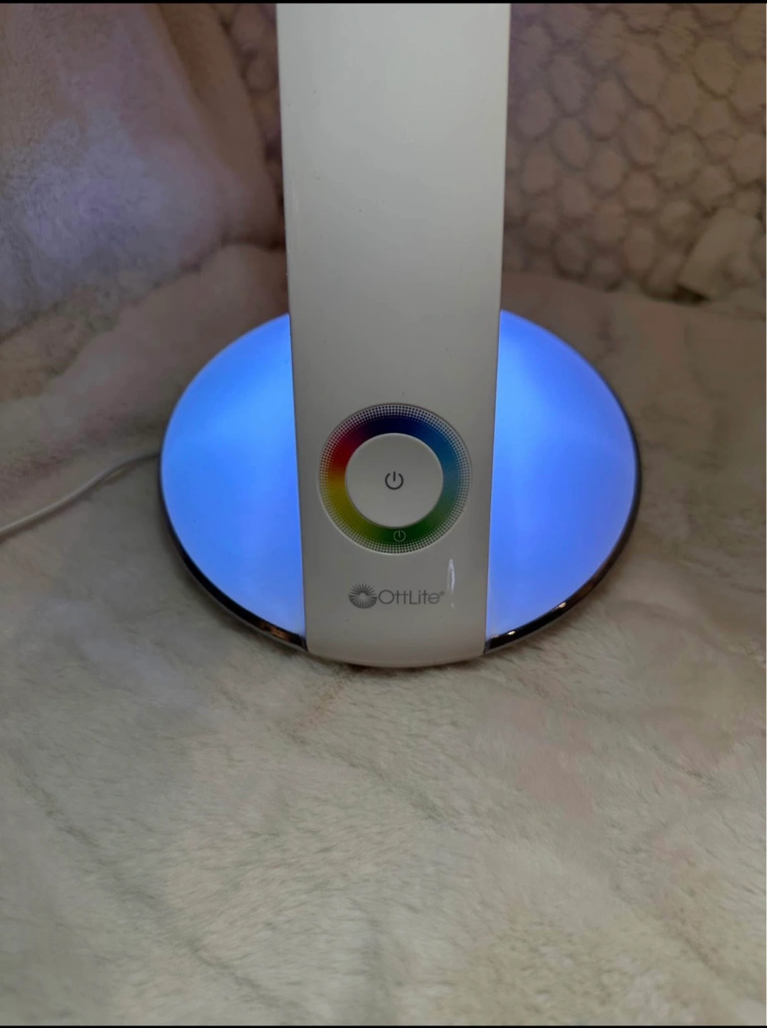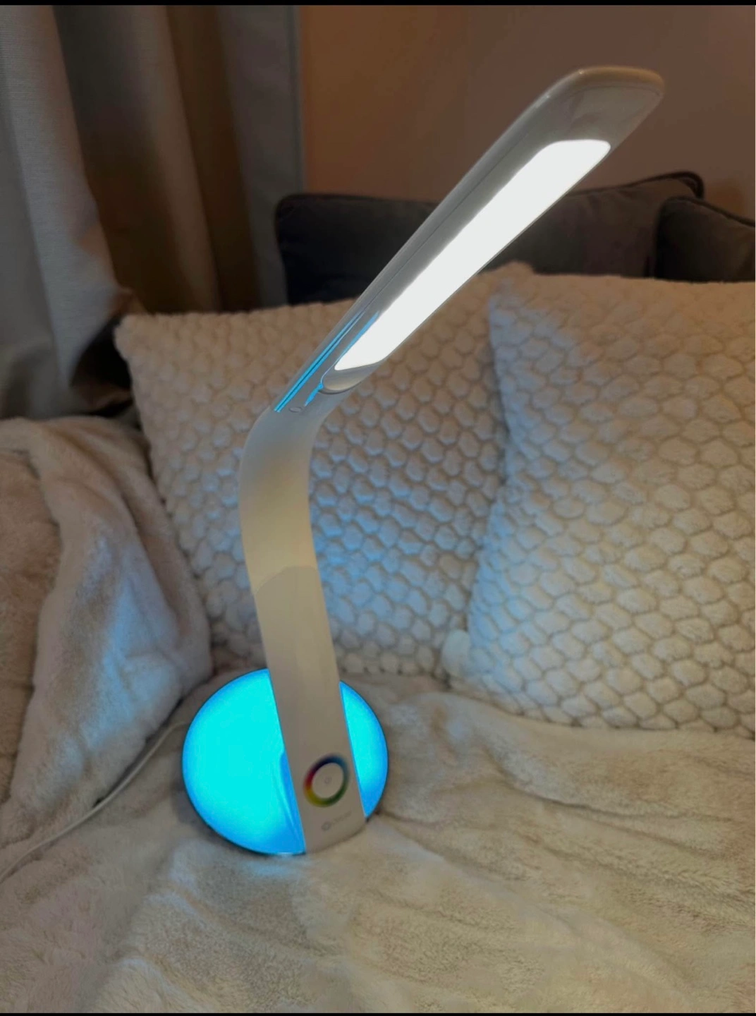 Sleek white desk lamp. Flexible gooseneck. Colour changing base. LED light. Great for studying or working.