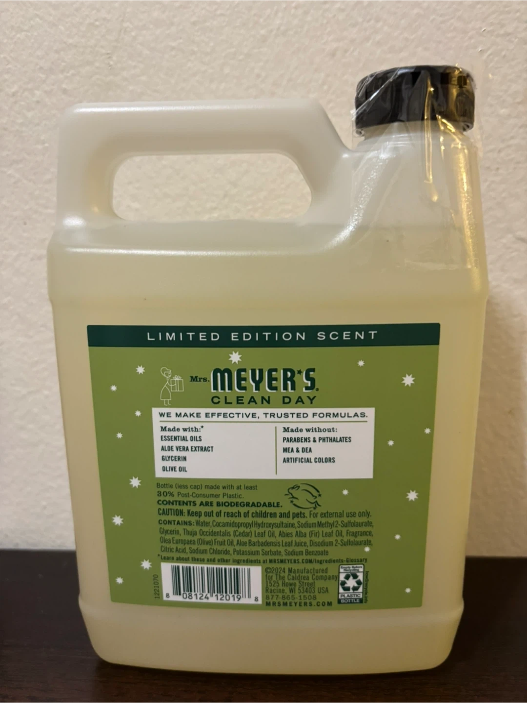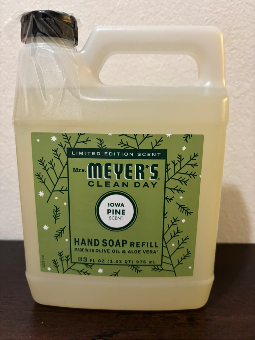 This is a Mrs. Meyer's Clean Day hand soap refill in the Iowa Pine scent. It's made with olive oil and aloe vera. The bottle contains 33 fluid ounces of soap.
