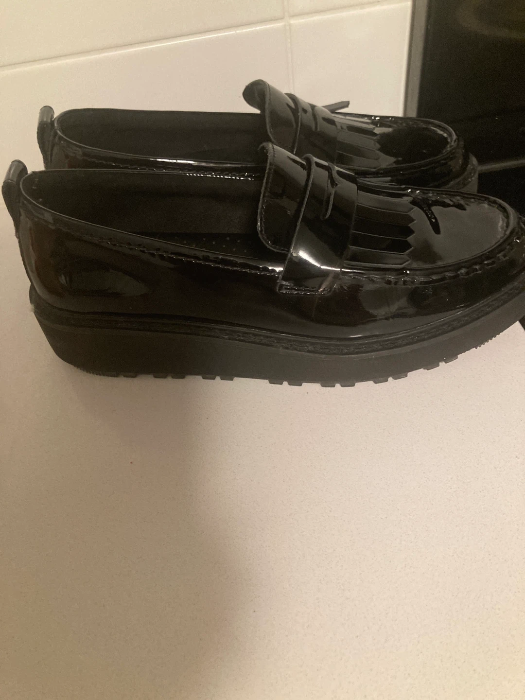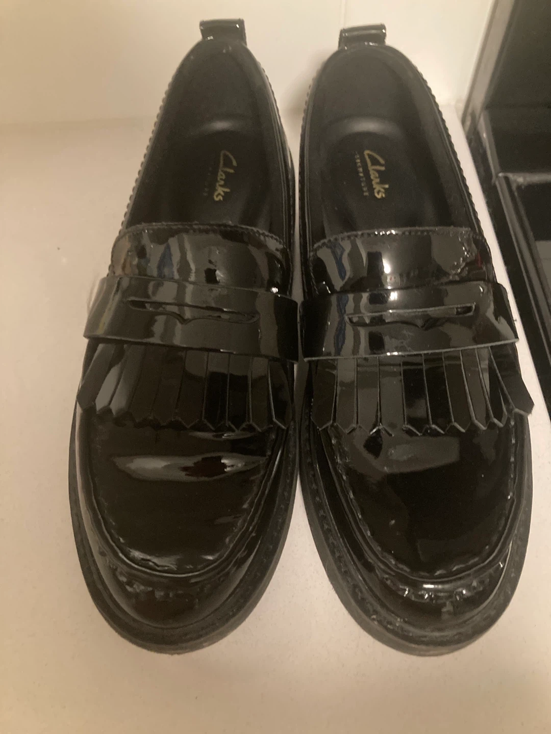 Clarks Signature loafers in a shiny black patent finish. They're designed with contour cushion for comfort. These slip-on shoes are great for everyday wear. Worn ONCE for fashion shoot