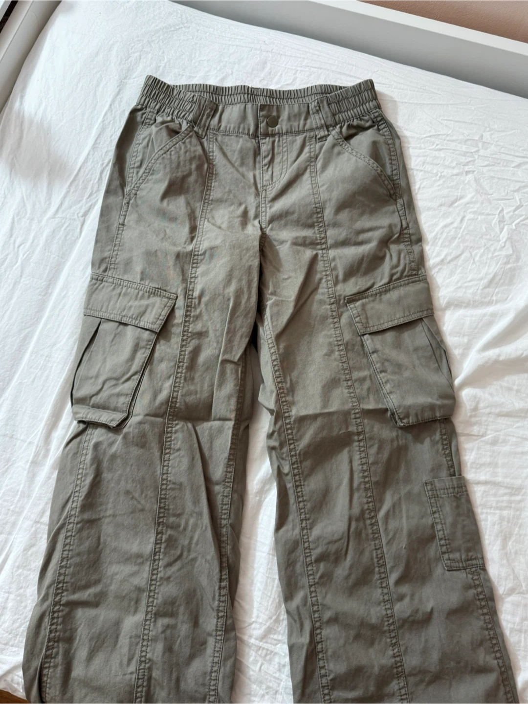 These are khaki coloured cargo pants with an elastic waistband and button closure. They feature multiple pockets for storage. These pants are made from a durable fabric.