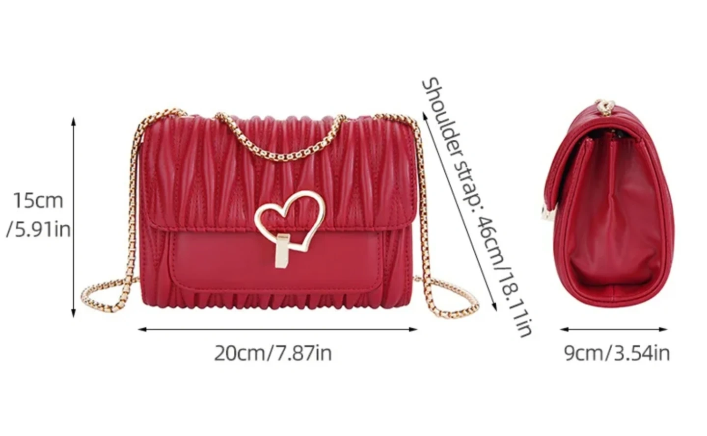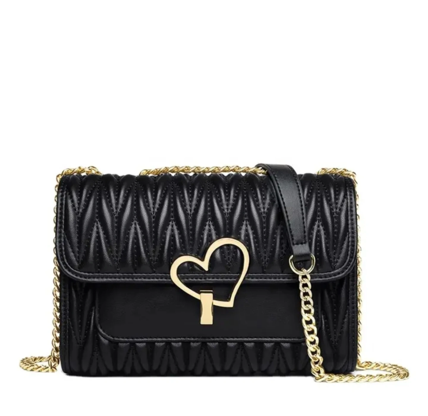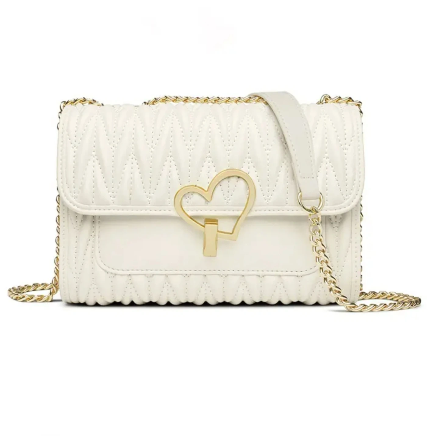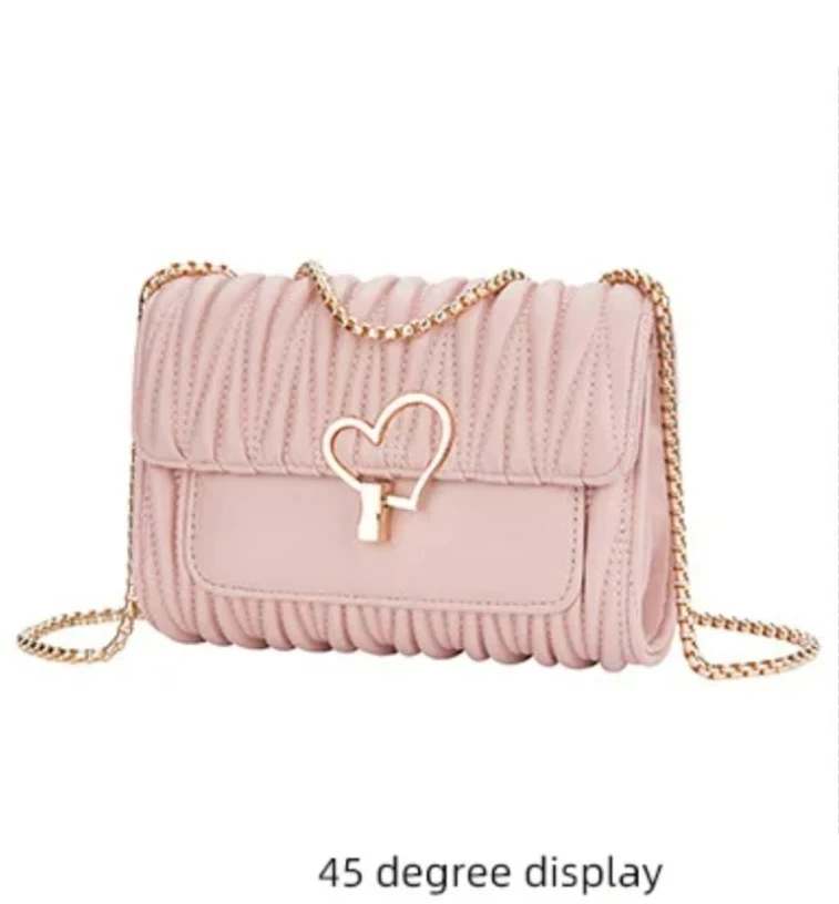 Women's crossbody bag with a gold-tone chain strap and a cute heart-shaped clasp. It's got a textured, ruched flap design. Available in Black , Off-white, and Pink