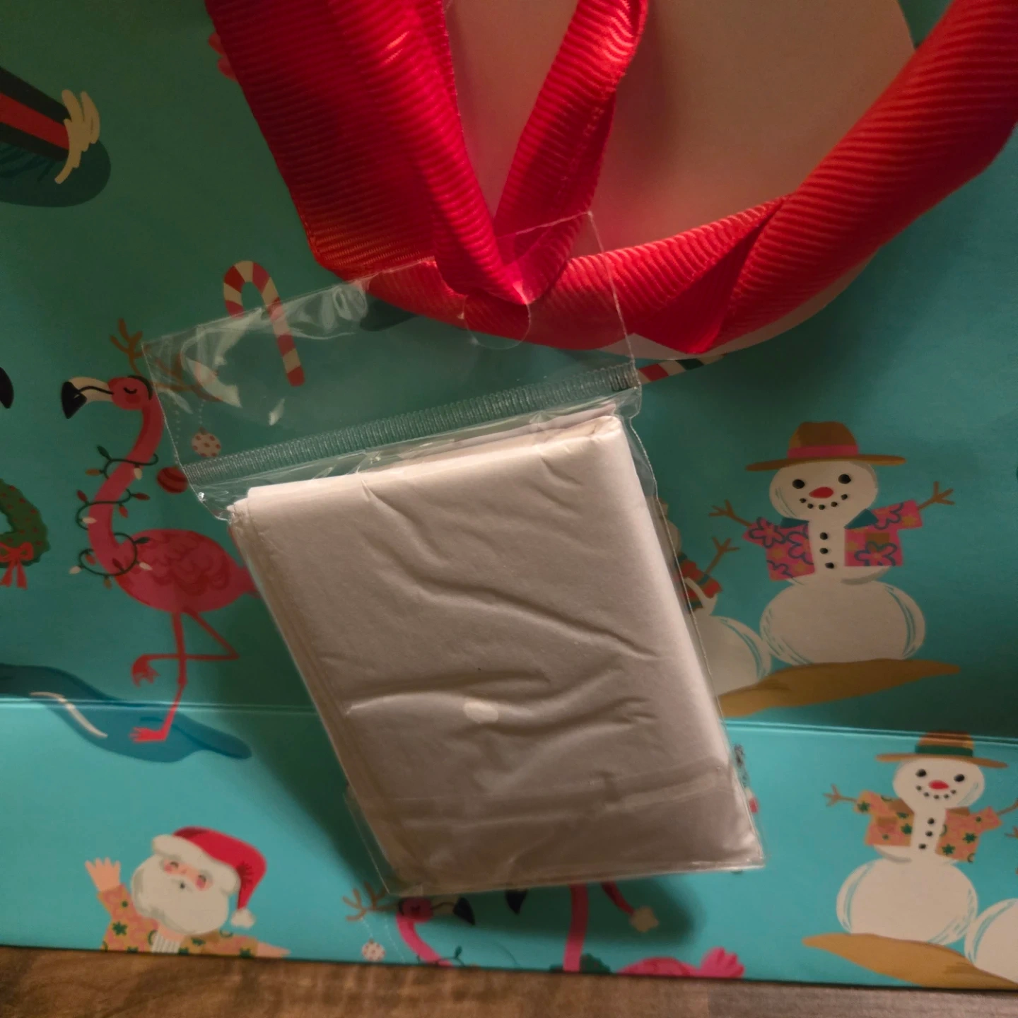 This festive gift bag features a "Merry Christmas" message and a fun tropical flamingo and snowman design. It includes a small bag of tissue paper. Great for holiday presents!