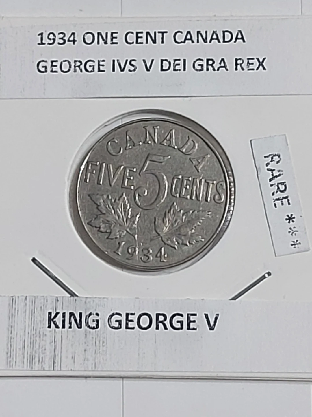 This is a 1934 Canadian 5 cent coin featuring King George V. It's a rare find for coin collectors. The coin is made of nickel.