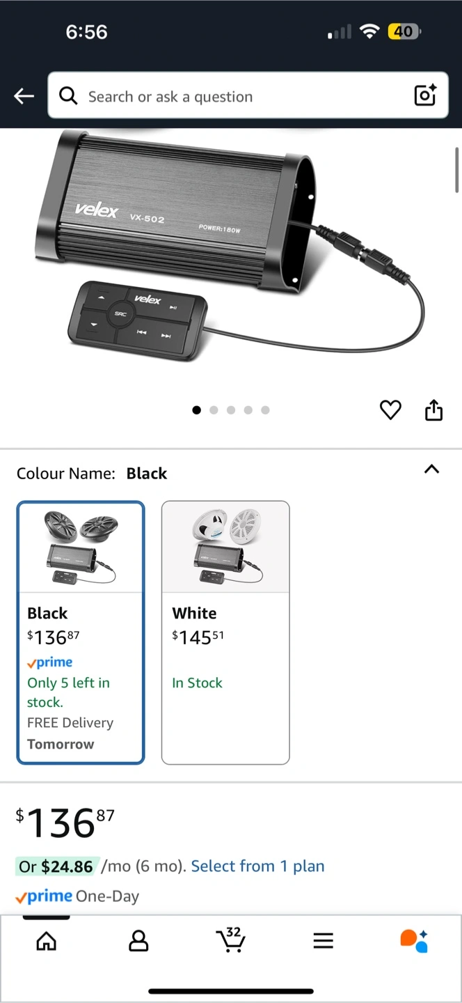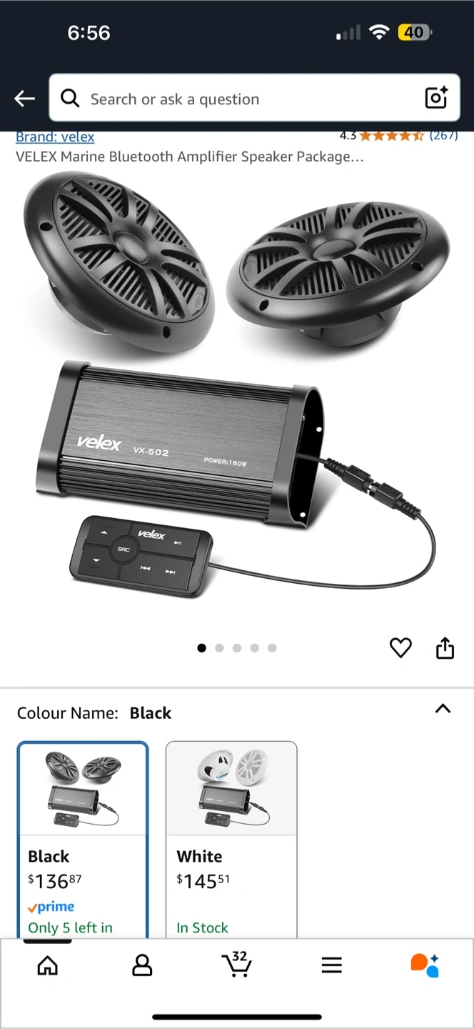 The package contains an amplifier with a remote control, and two speakers. The amplifier is black, with a sleek design. You could definitely unwind on your boat with this great speaker set. New just opened box.
