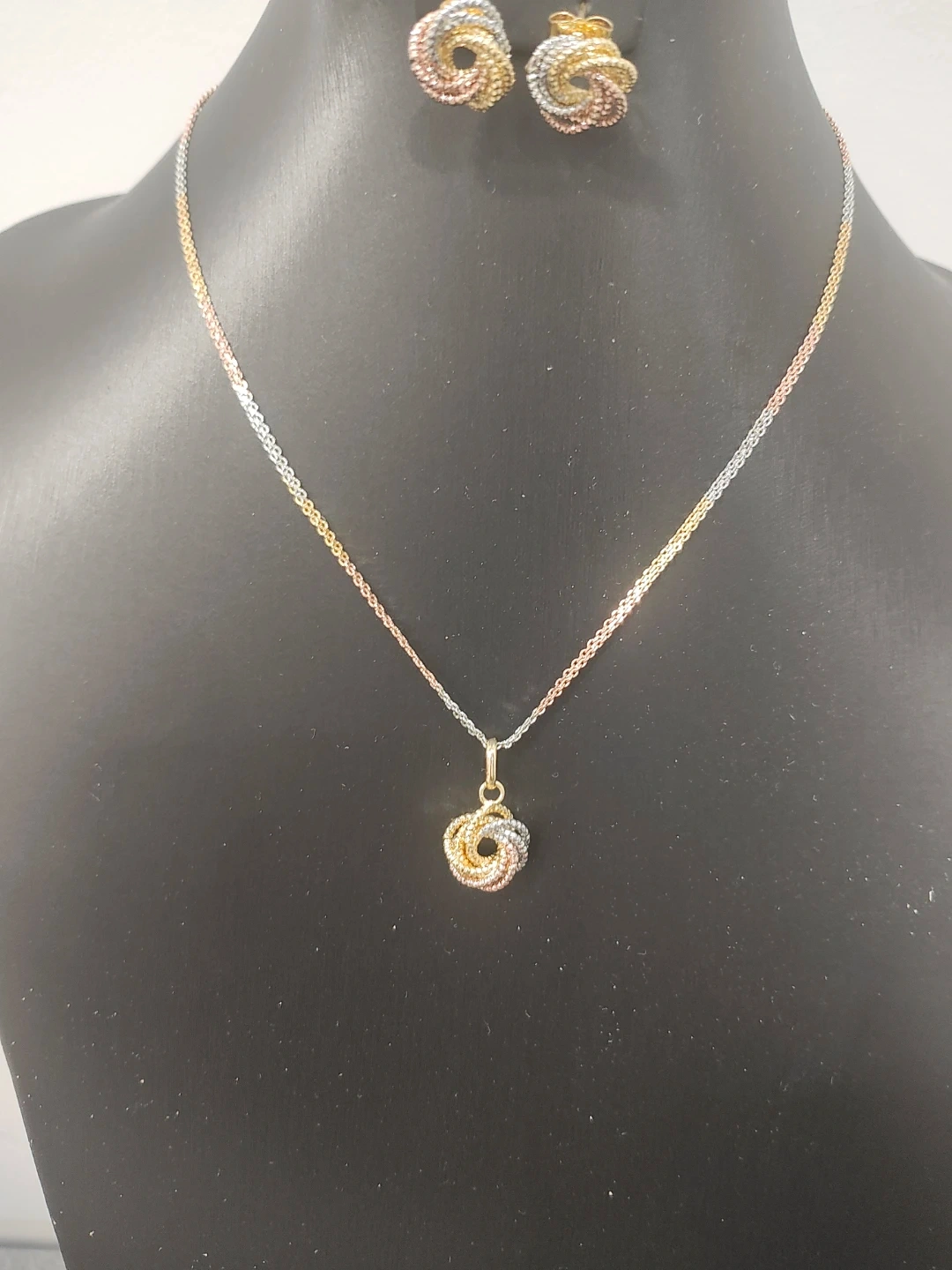 Tri-tone knot pendant necklace and earring set