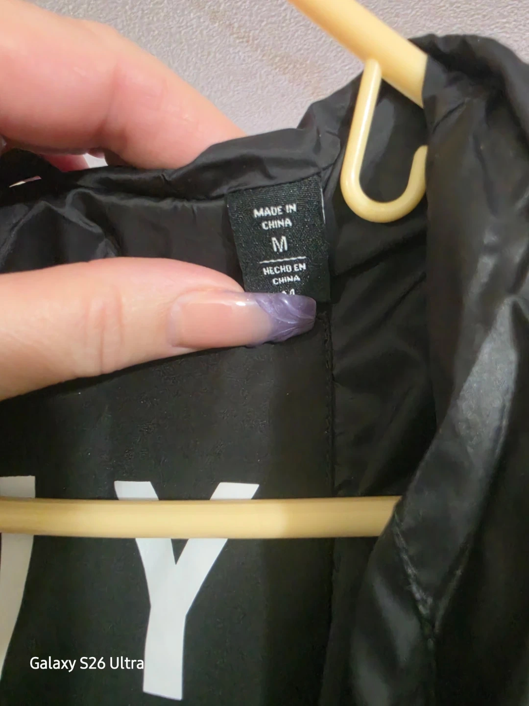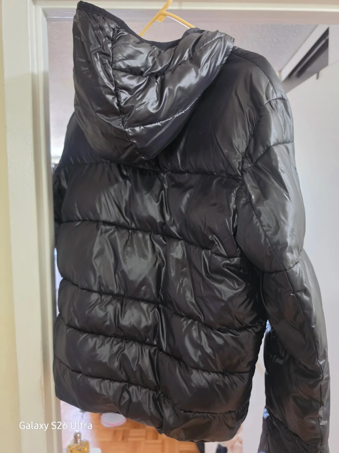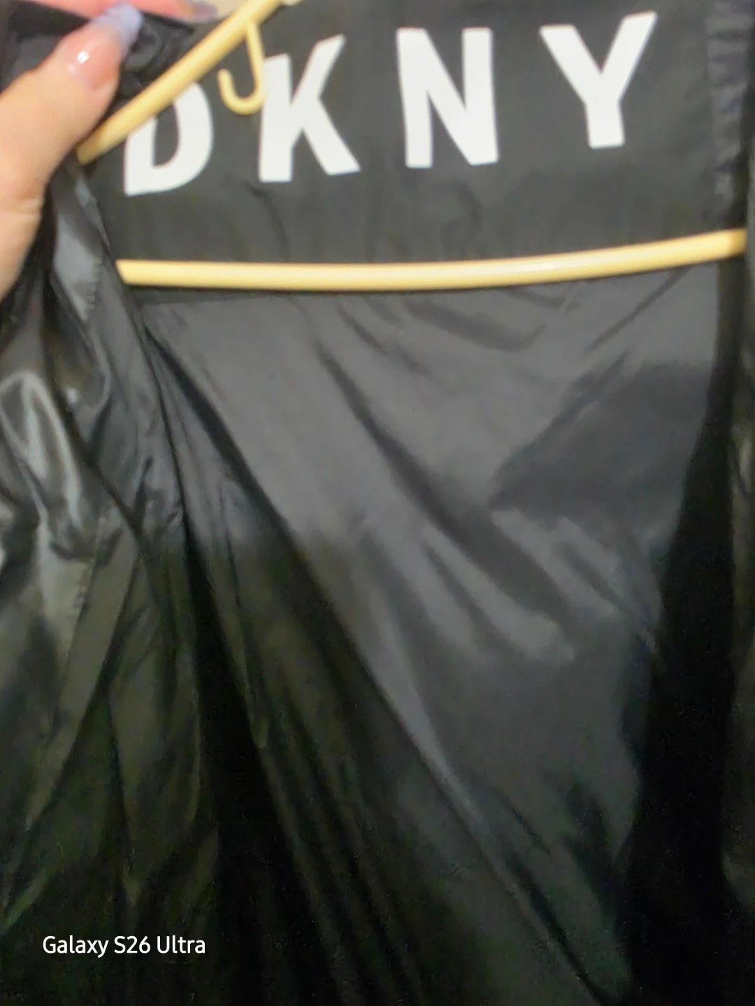 A black DKNY puffer jacket. It's a size medium. This jacket has a shiny, water-resistant finish and a comfortable hood. Perfect for cooler weather!