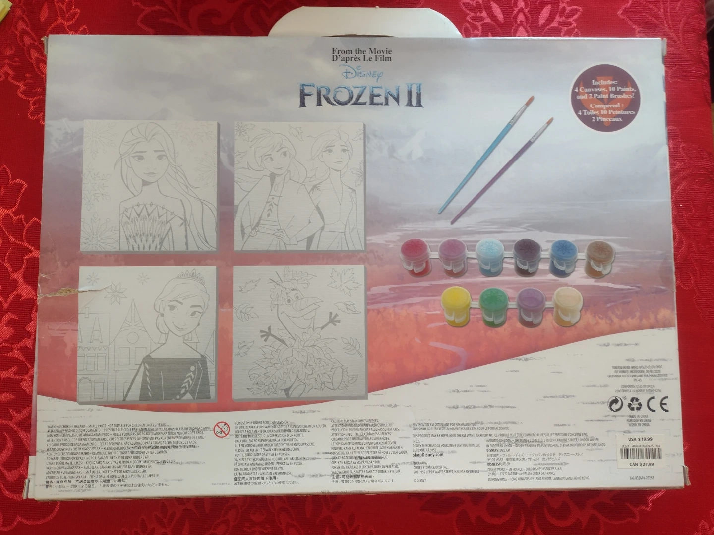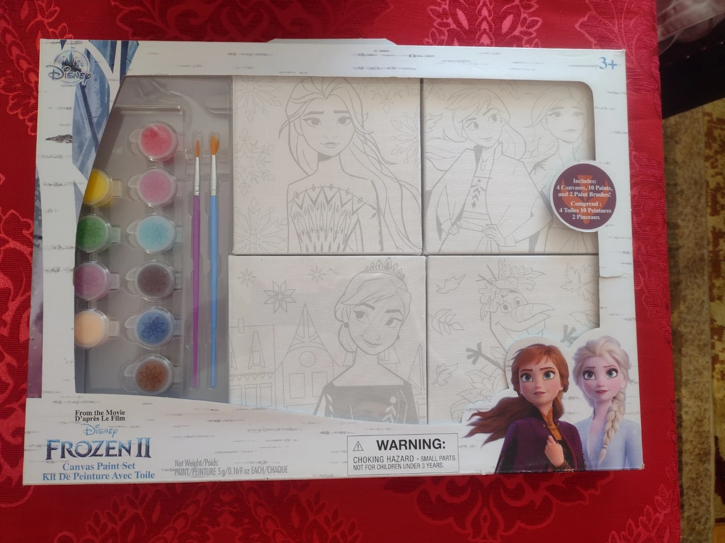 This paint set includes 4 canvases, 8 paints, and 2 brushes. It's from the movie Frozen II and is recommended for ages 3 and up. The canvases feature characters like Elsa, Anna, and Olaf.