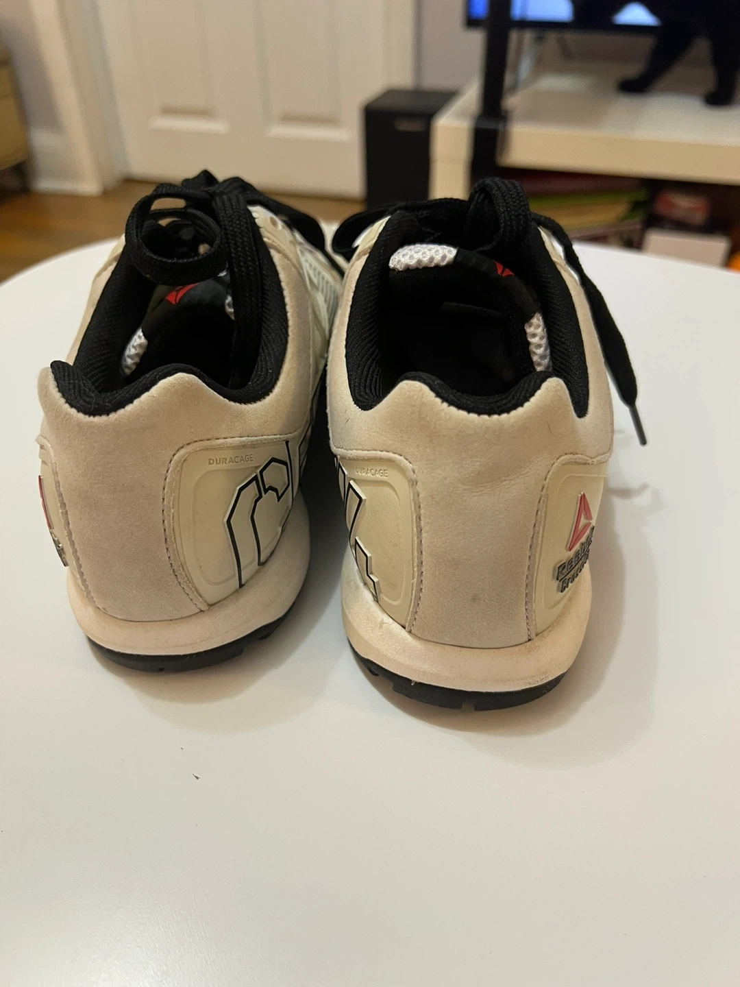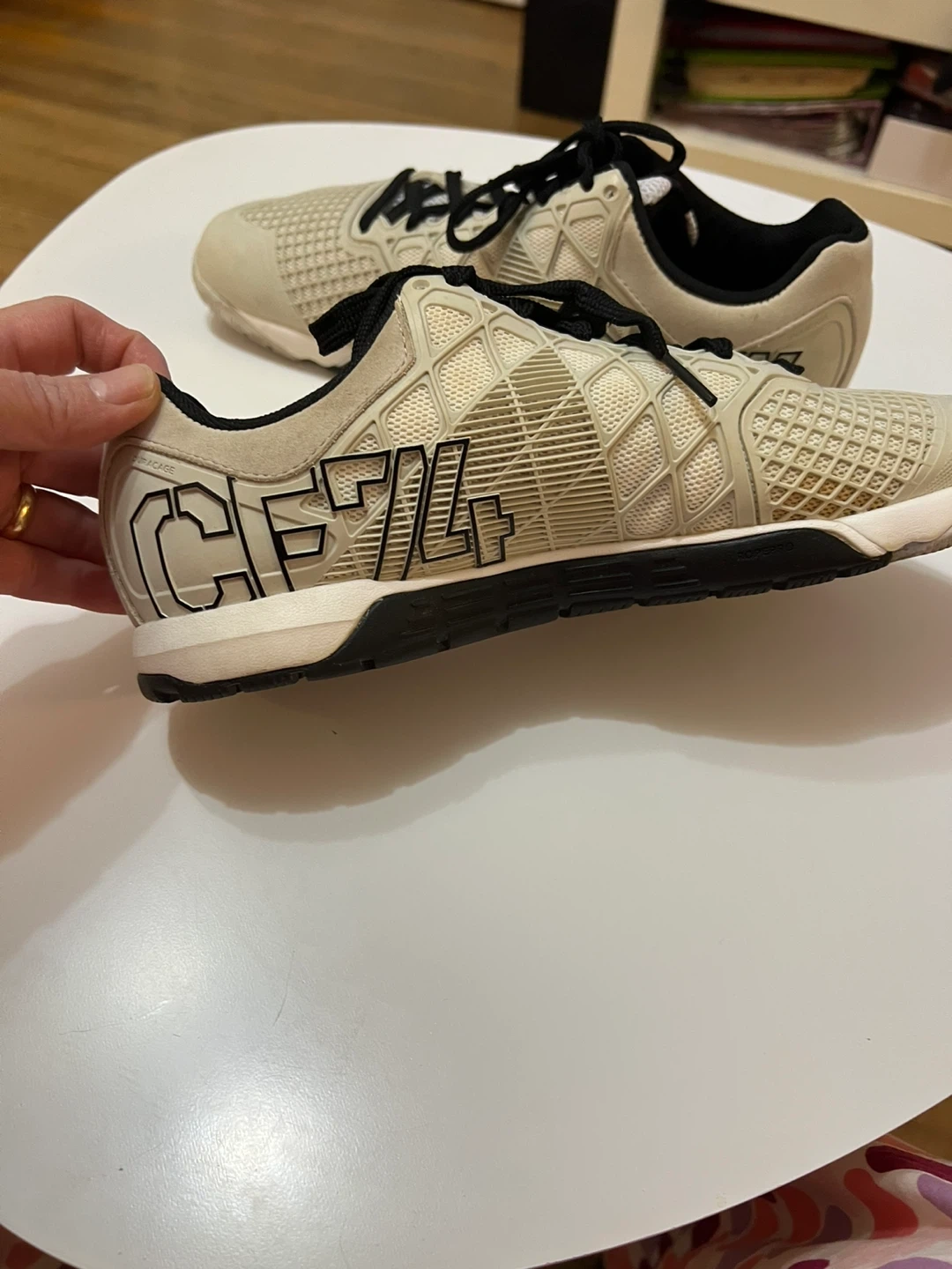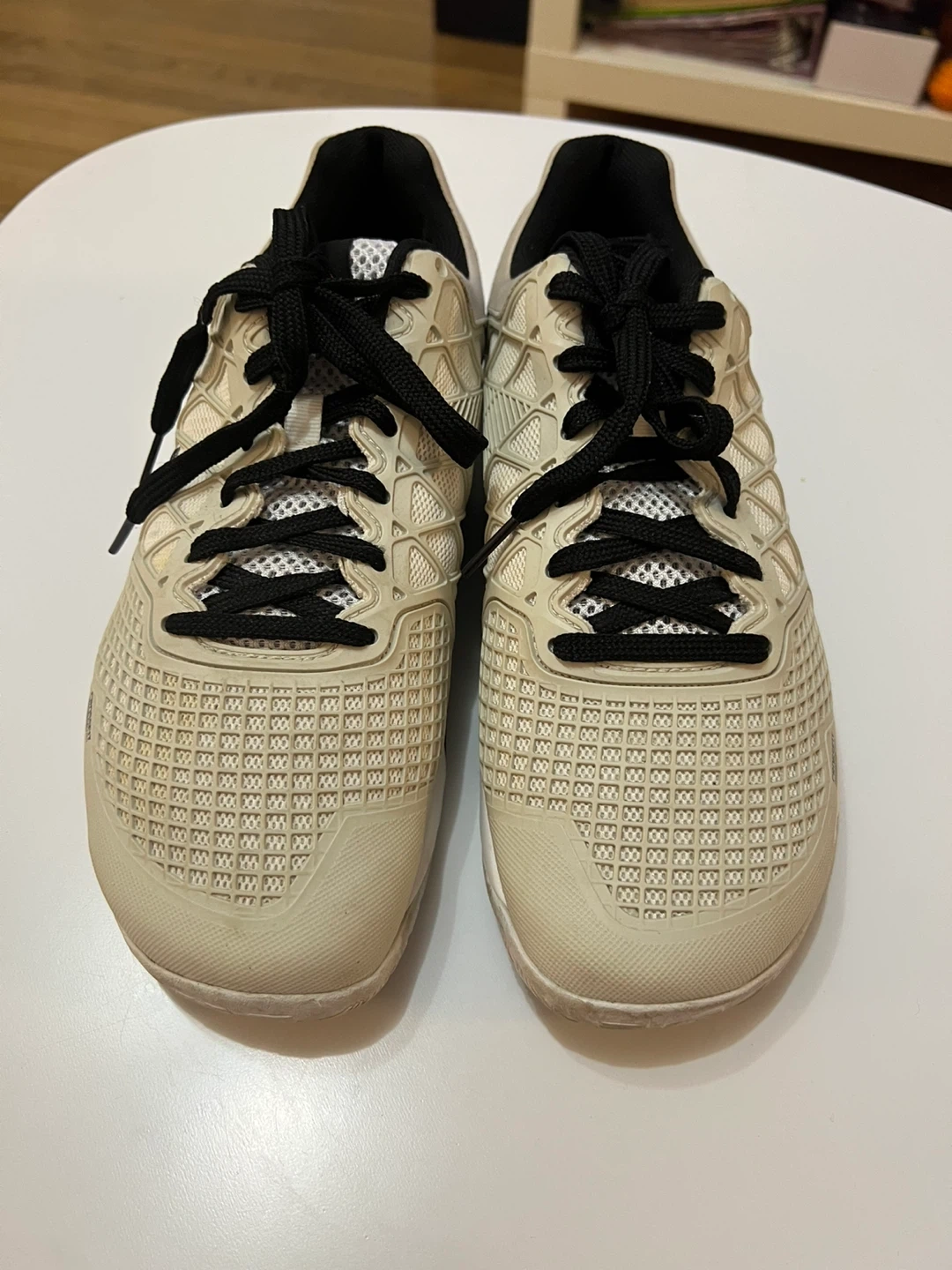 These Reebok CrossFit Nano shoes are designed for training. They're a beige colour with black laces and accents. The soles provide good grip for workouts. Size 9.