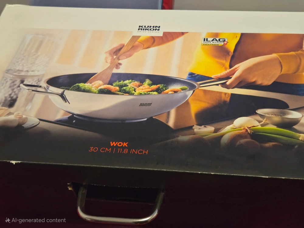 New Kuhn Rikon wok. 30cm diameter. Features Ilag non-stick coating. Includes glass lid.