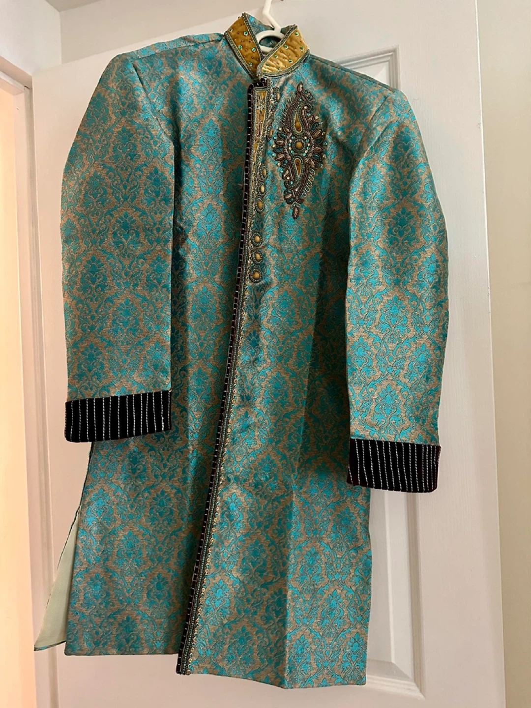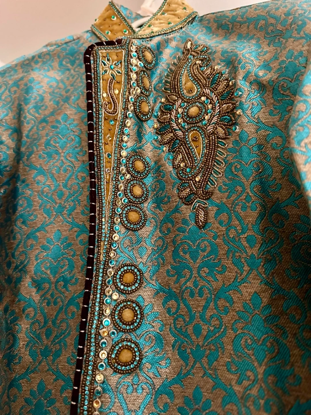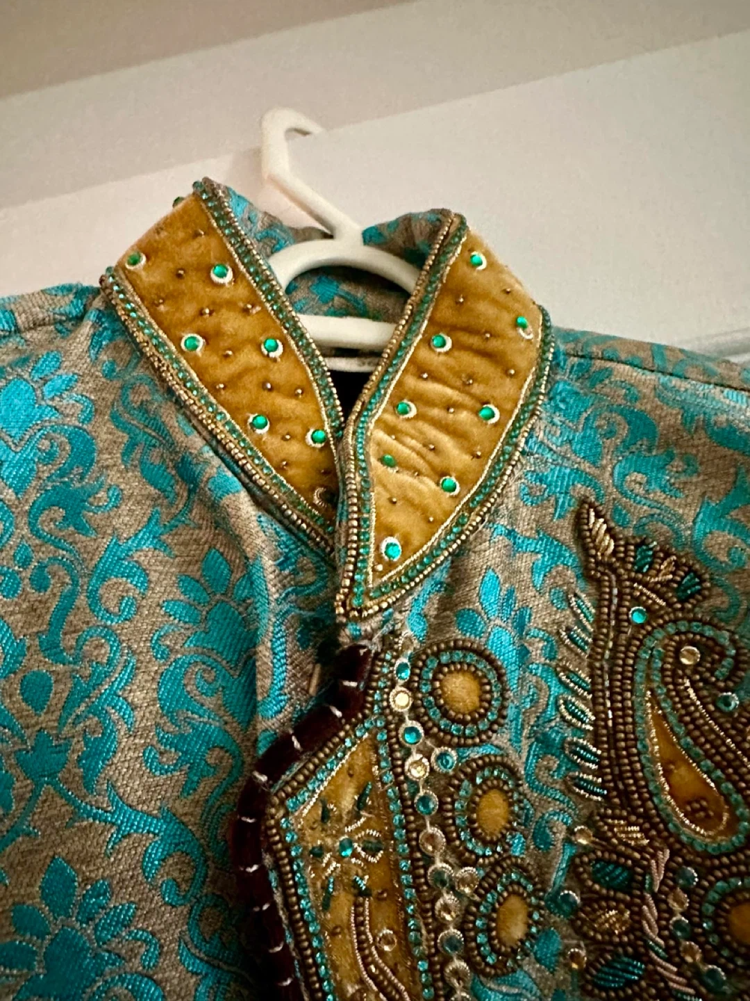 This traditional sherwani features a stunning turquoise and gold brocade fabric. It's adorned with intricate beadwork and embroidery around the collar and placket. The cuffs are accented with black and gold stripes. It's perfect for cultural events and celebrations!