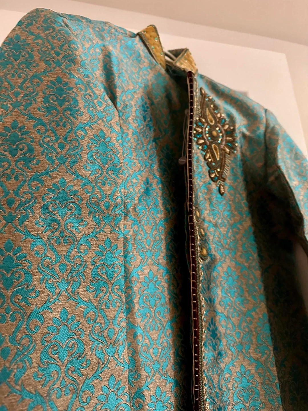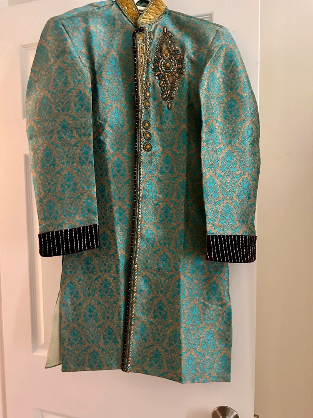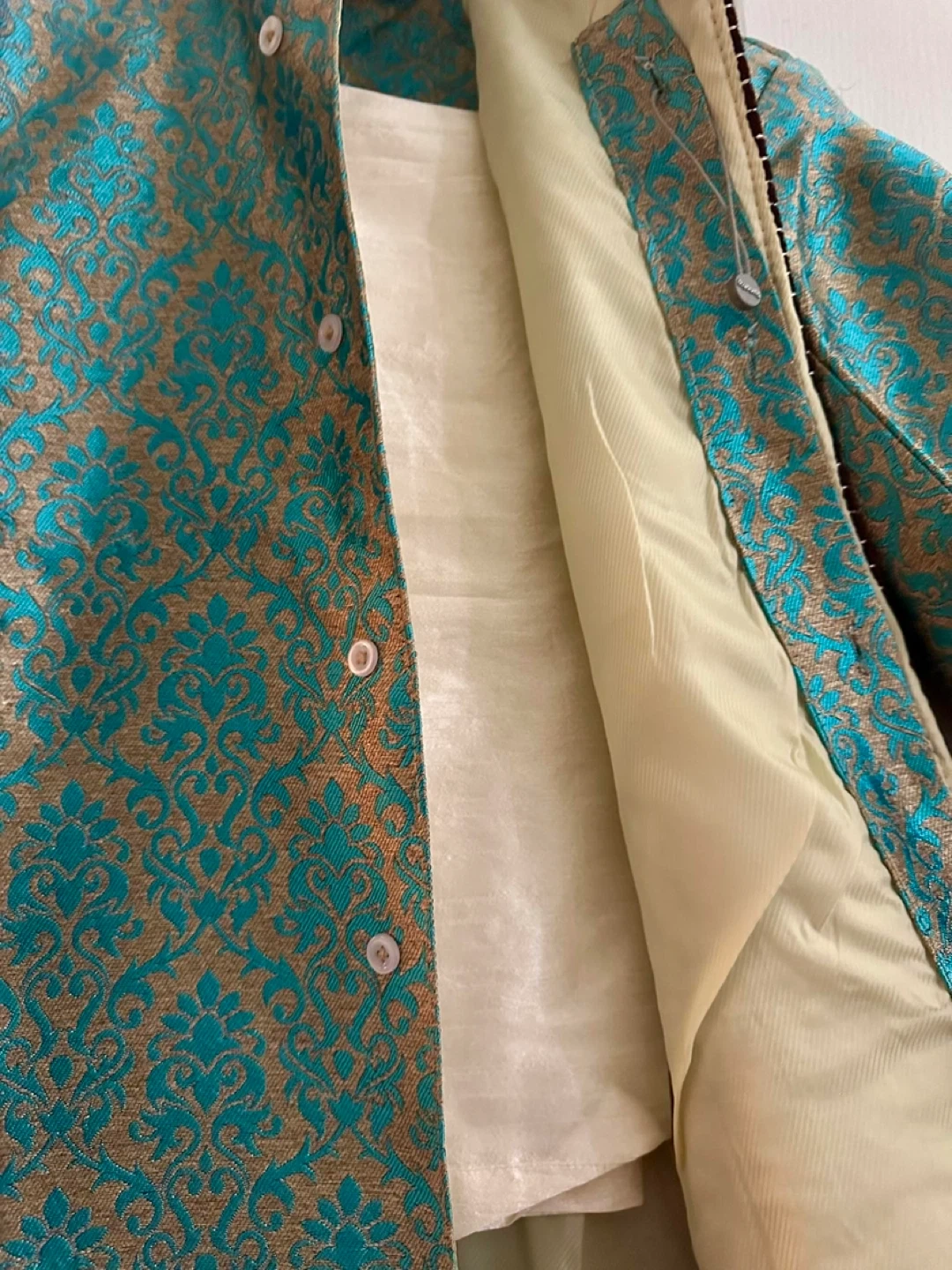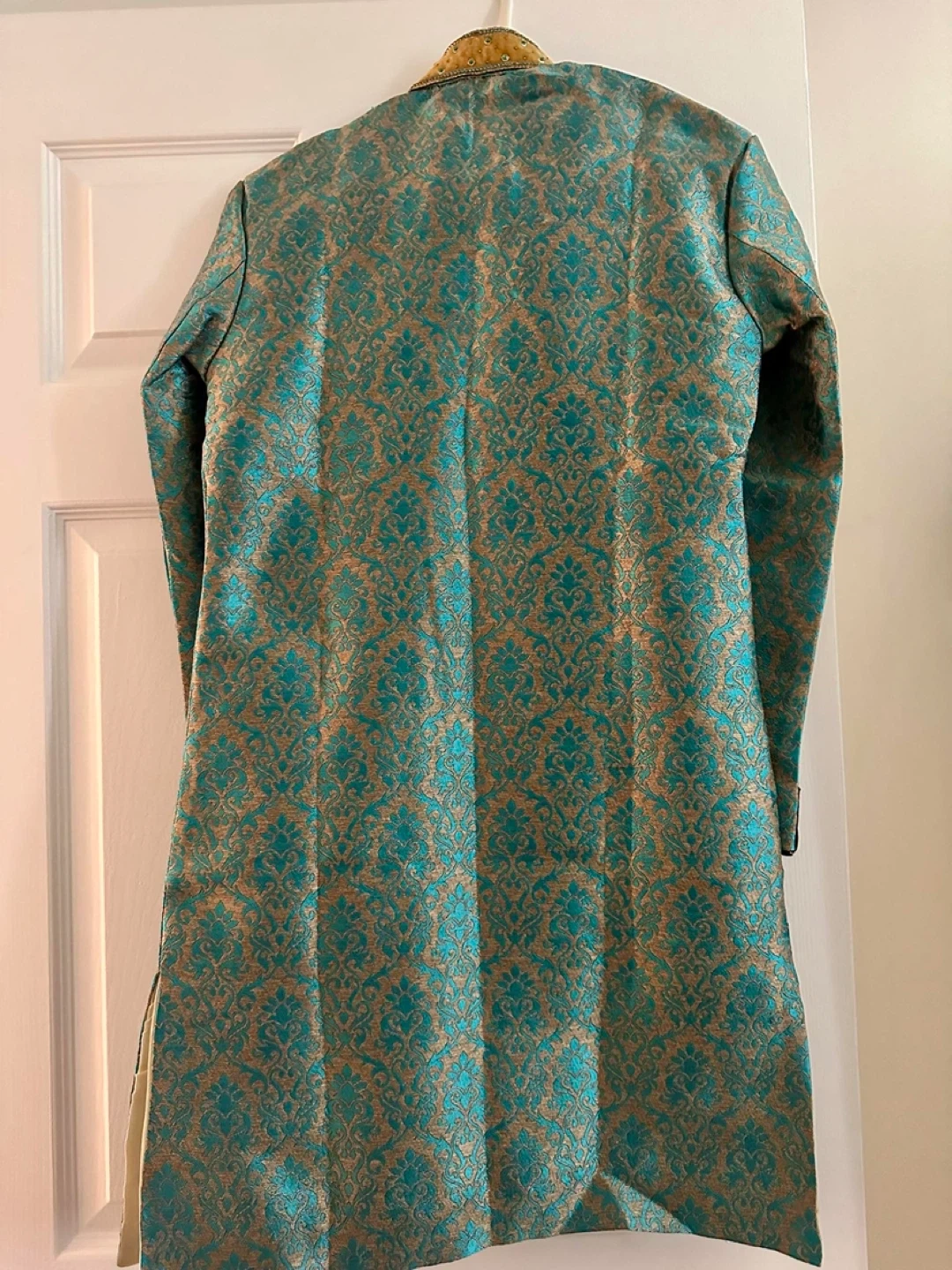 This traditional sherwani features a stunning turquoise and gold brocade fabric. It's adorned with intricate beadwork and embroidery around the collar and placket. The cuffs are accented with black and gold stripes. It's perfect for cultural events and celebrations!