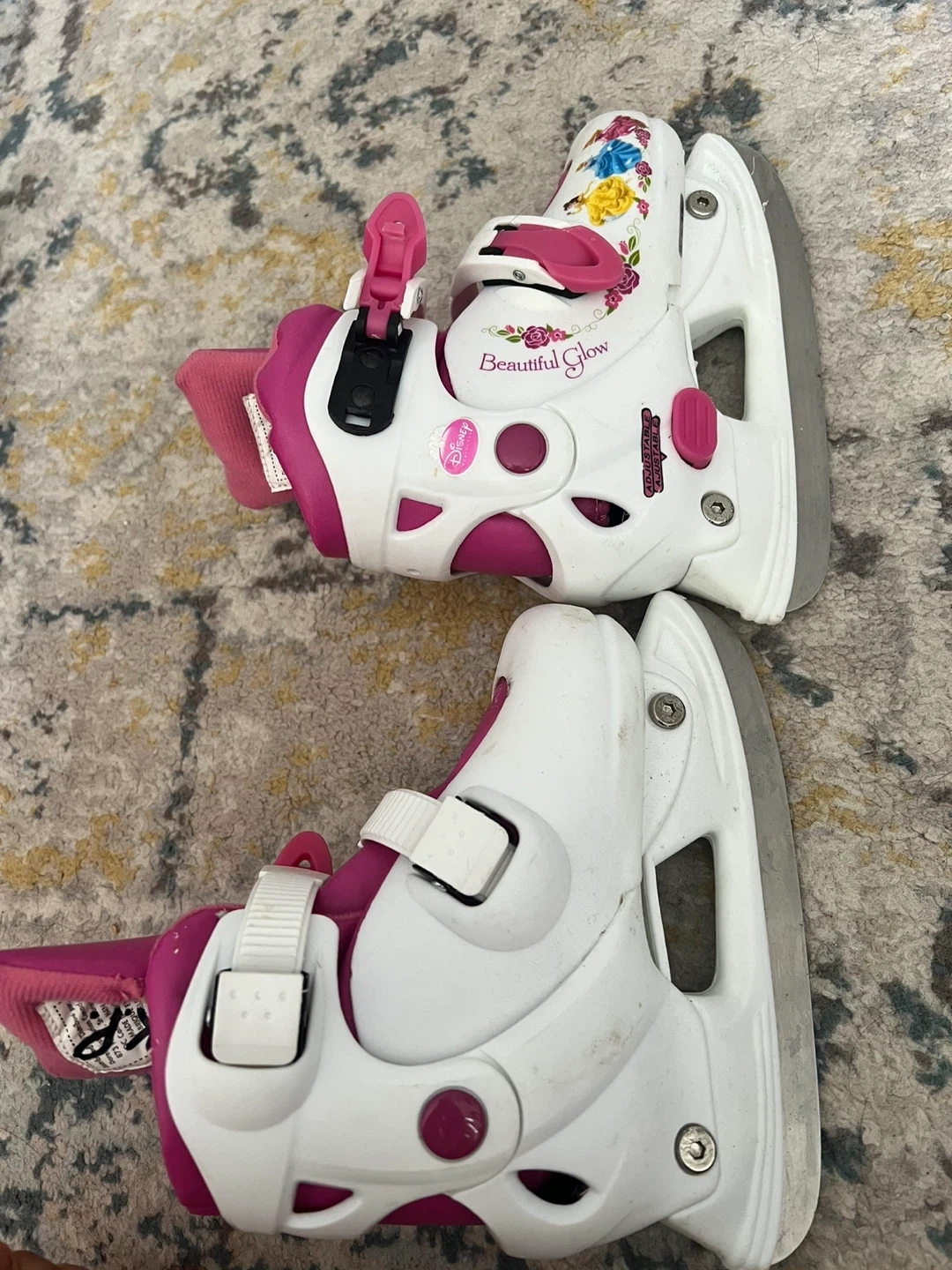 These Disney ice skates feature a "Beautiful Glow" design with floral accents. They are adjustable for a better fit and come in pink and white. Perfect for little skaters learning to glide on the ice!