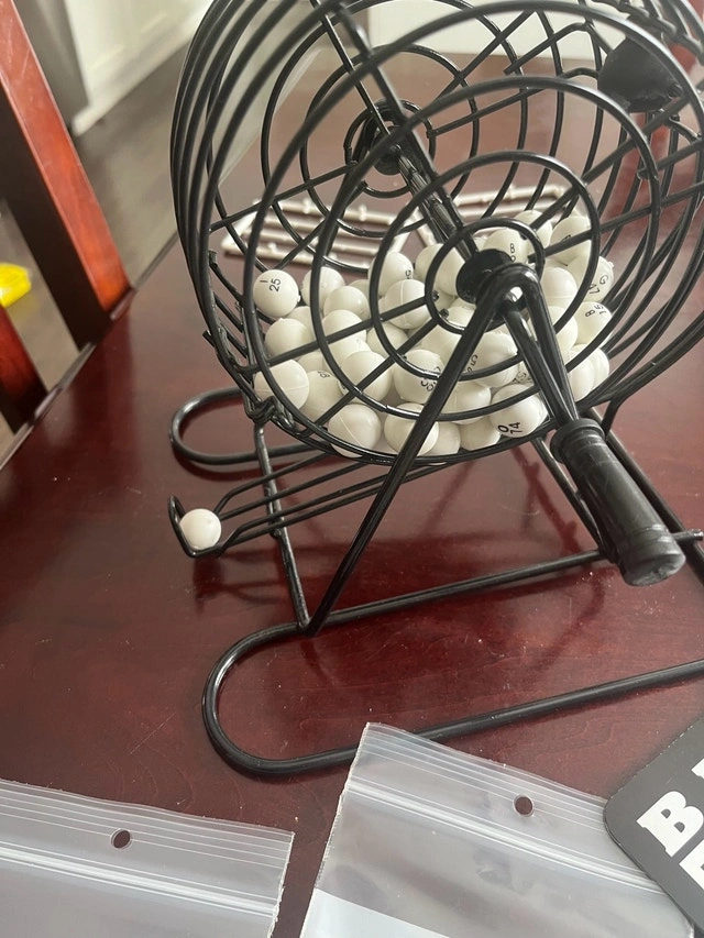 Get ready to shout BINGO with this complete bingo game set! This used set includes a sturdy metal cage, numbered balls, bingo cards, and colourful markers. Everything you need for a fun game night with family and friends. While this set has brought joy to many gatherings, it's now looking for a new home to continue the winning streak. Embrace the thrill of the game, because if the ad is up, the bingo balls are still rolling! Cash accepted.