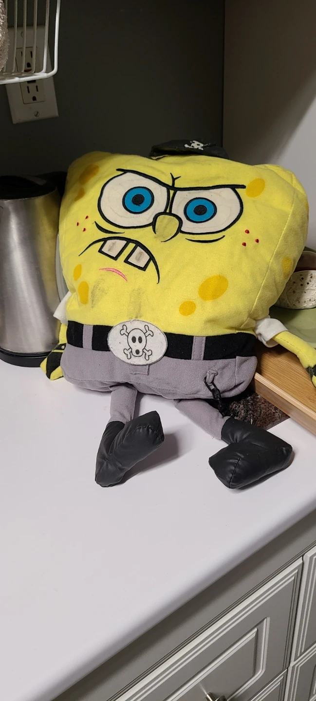 This is a Spongebob Squarepants plush toy dressed as a pirate. It's made of soft fabric and is yellow with a pirate hat and belt buckle with a skull and crossbones design.