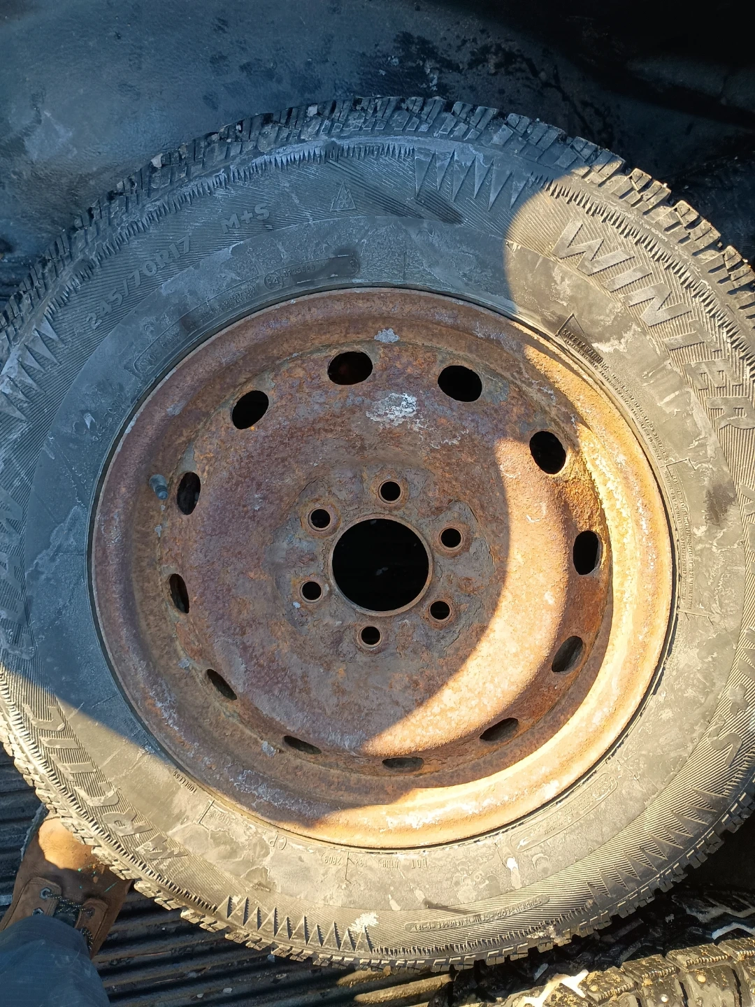 Three used winter tires on steel rims. Tire size is 245/70R17. Great for snowy conditions! Came off of the Ford F-150