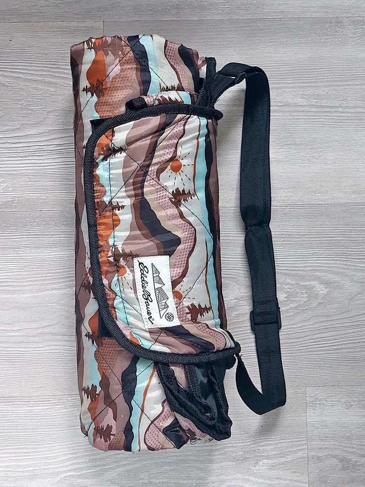This is an outdoor water-repellent polyester blanket by Eddie Bauer. Rolls up with an integrated velcro flap and carry strap.