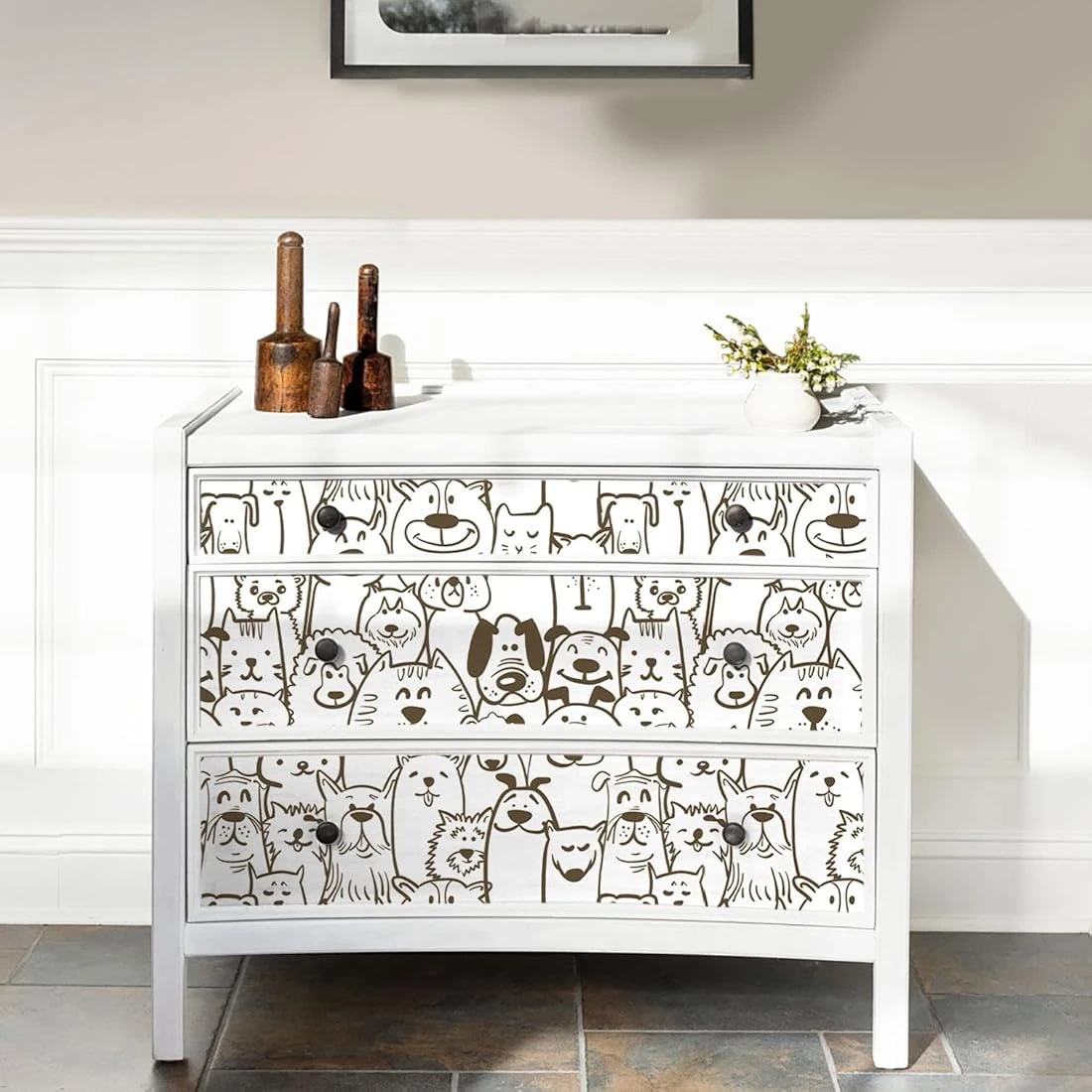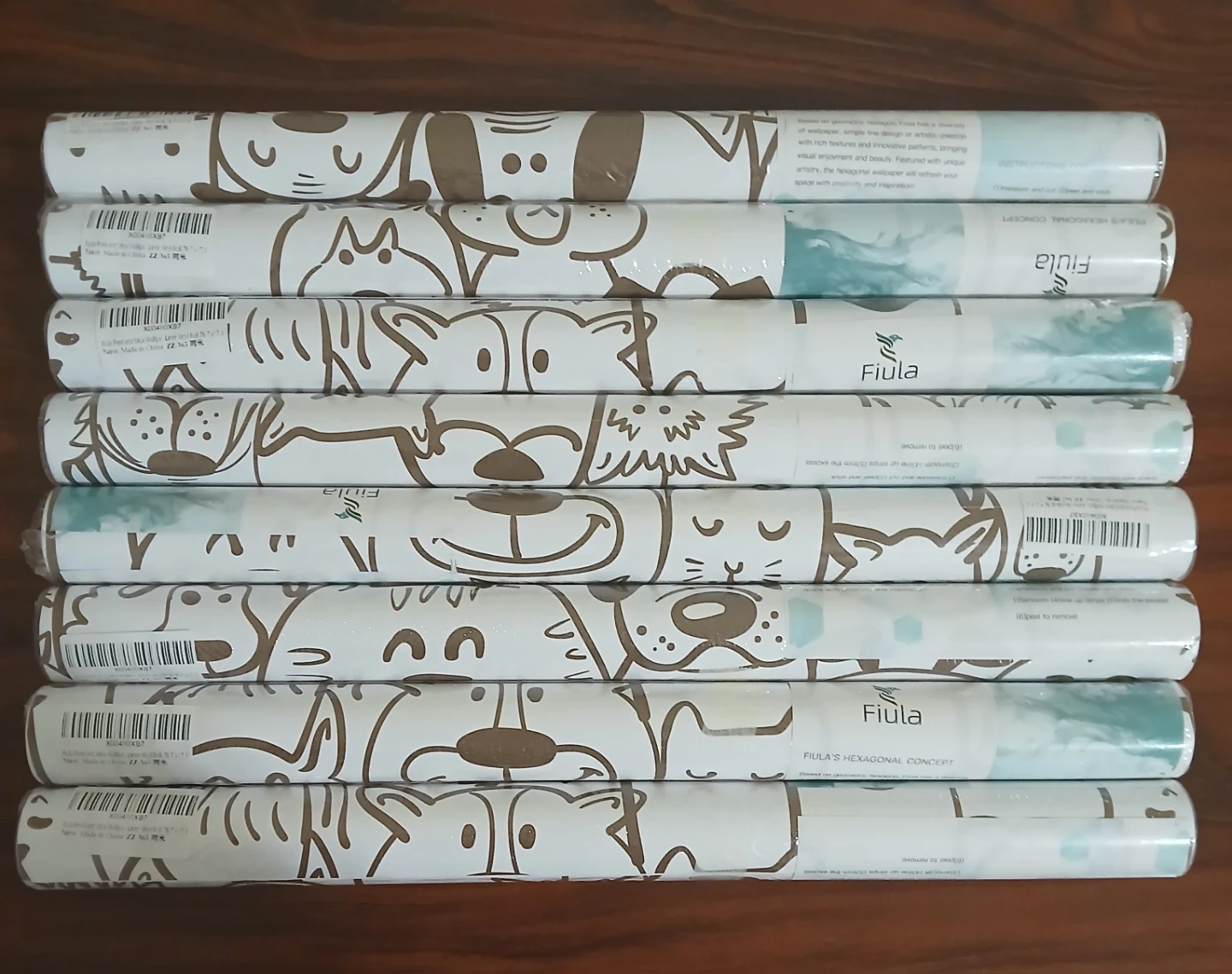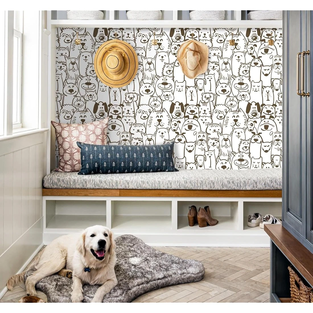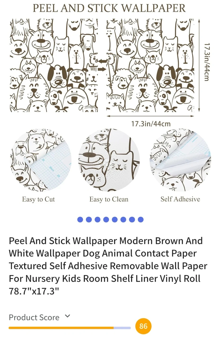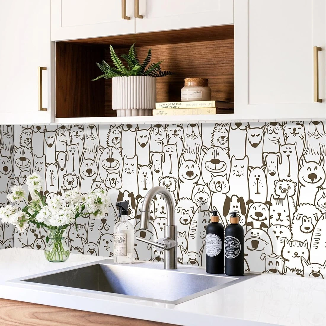This peel and stick wallpaper features a fun brown and white dog and cat and other animals print. It's self-adhesive, removable, and easy to cut and clean. Perfect for nurseries or kids' rooms!