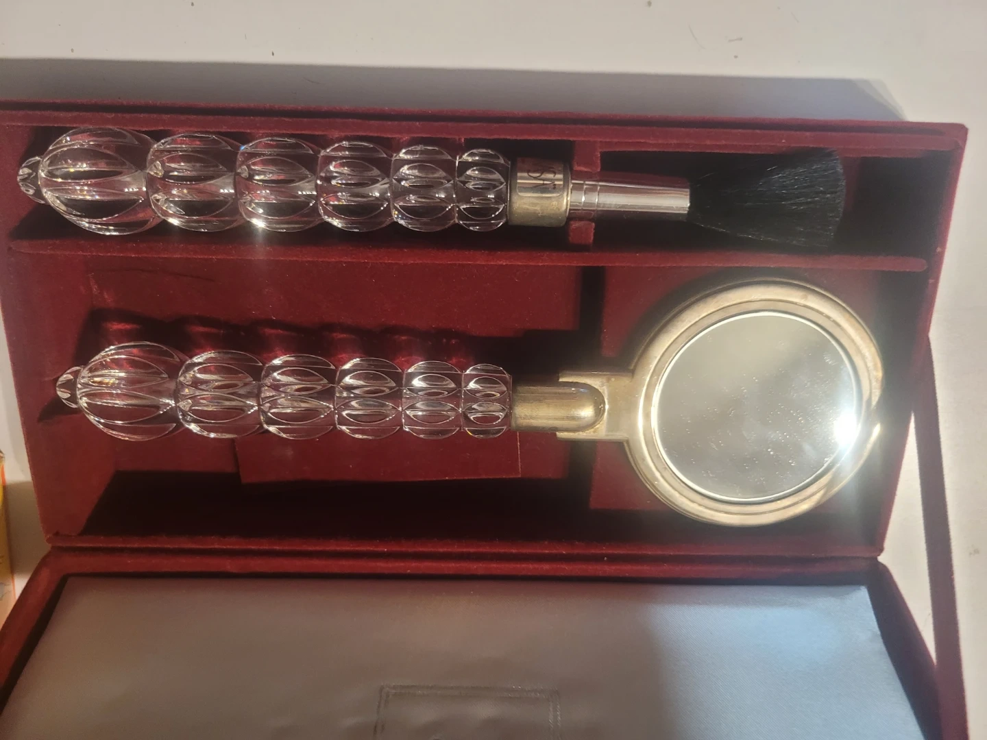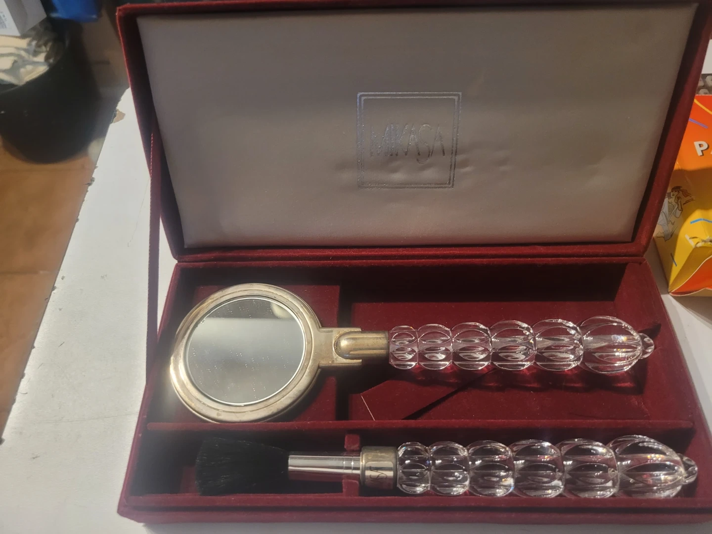This Mikasa vanity set includes a hand mirror and a makeup brush. Both pieces have decorative glass handles and are presented in a velvet-lined box. A nice addition to any dressing table!