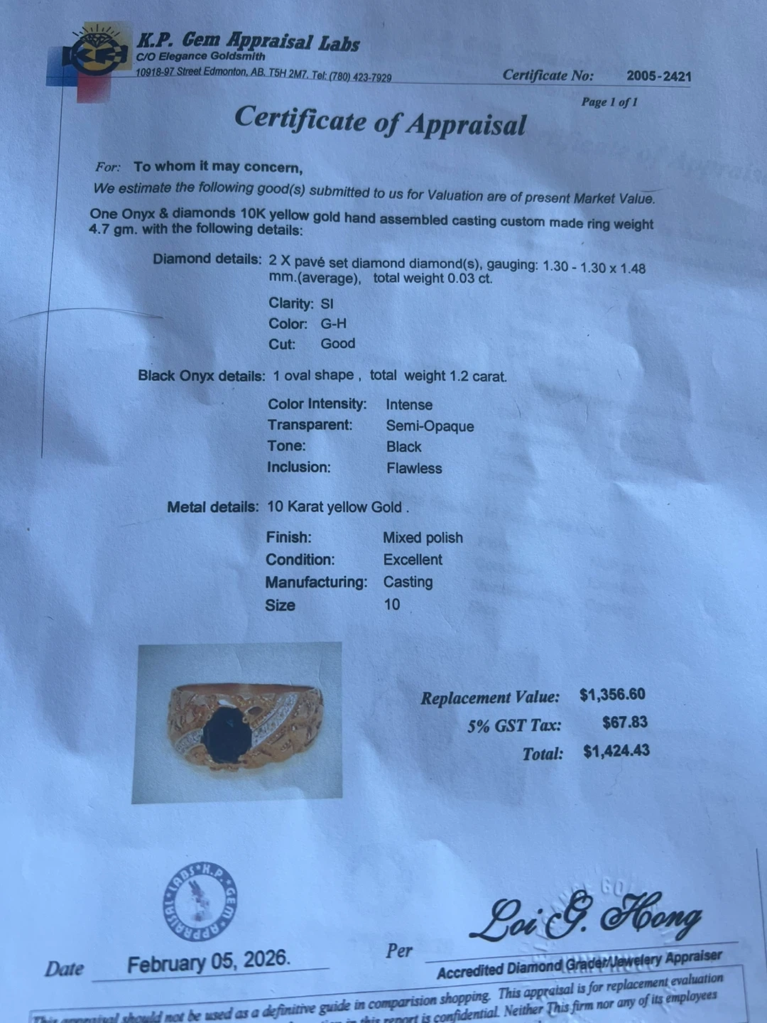 One 10K yellow gold ring featuring a black onyx and diamond accents. The ring is size 10 and has a mixed polish finish. This piece was hand assembled and cast.