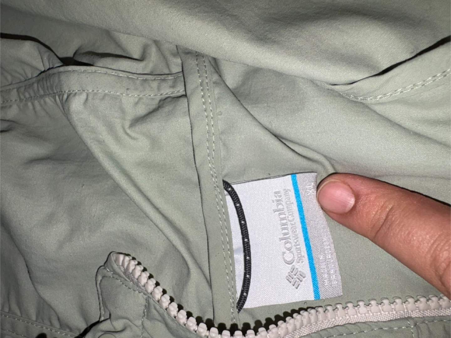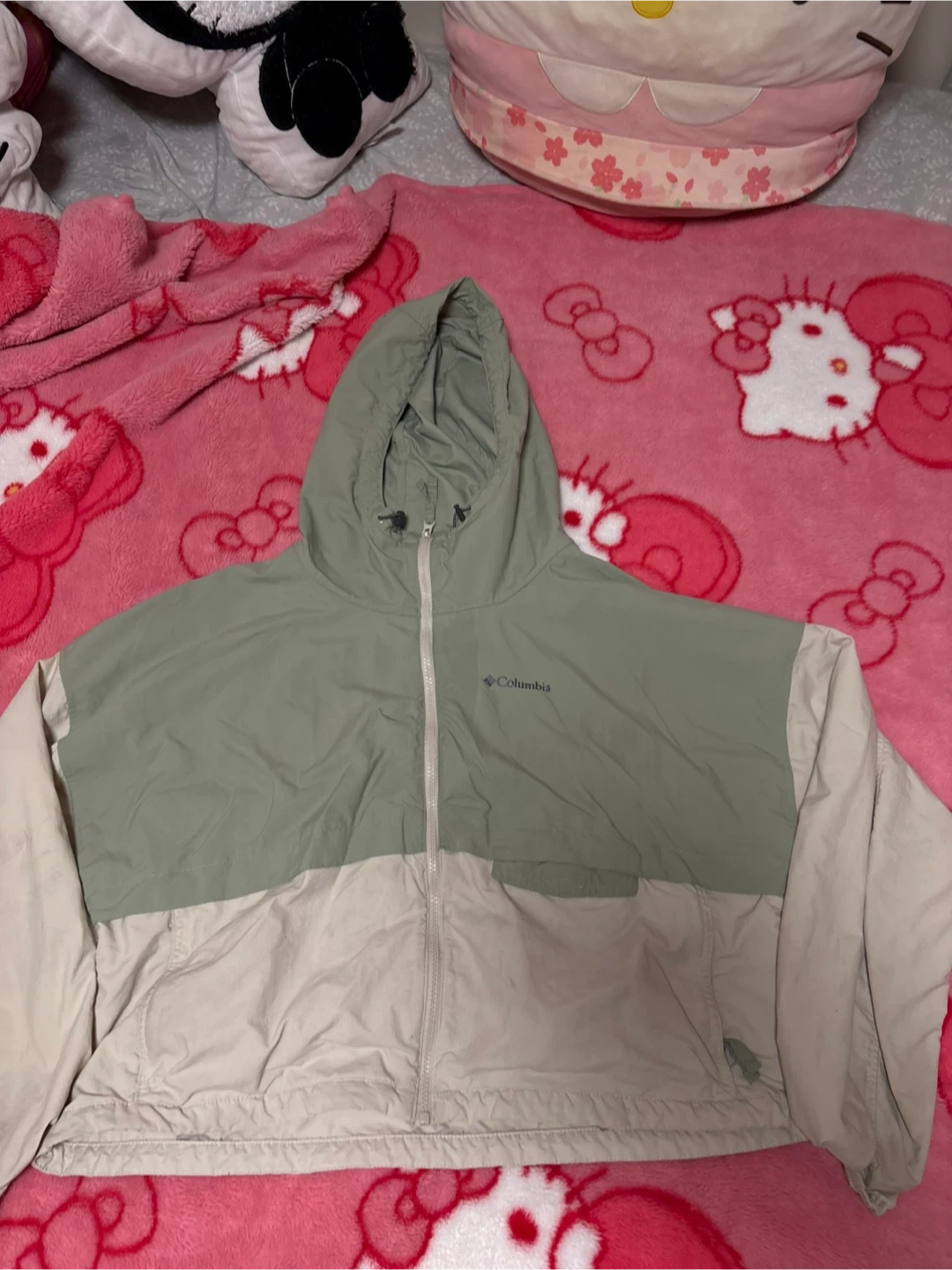 This is a Columbia Sportswear Company hooded jacket. It's a size XL. The jacket has a two-tone design with a light green upper half and a beige lower half. It features a full zip closure and an adjustable hood.