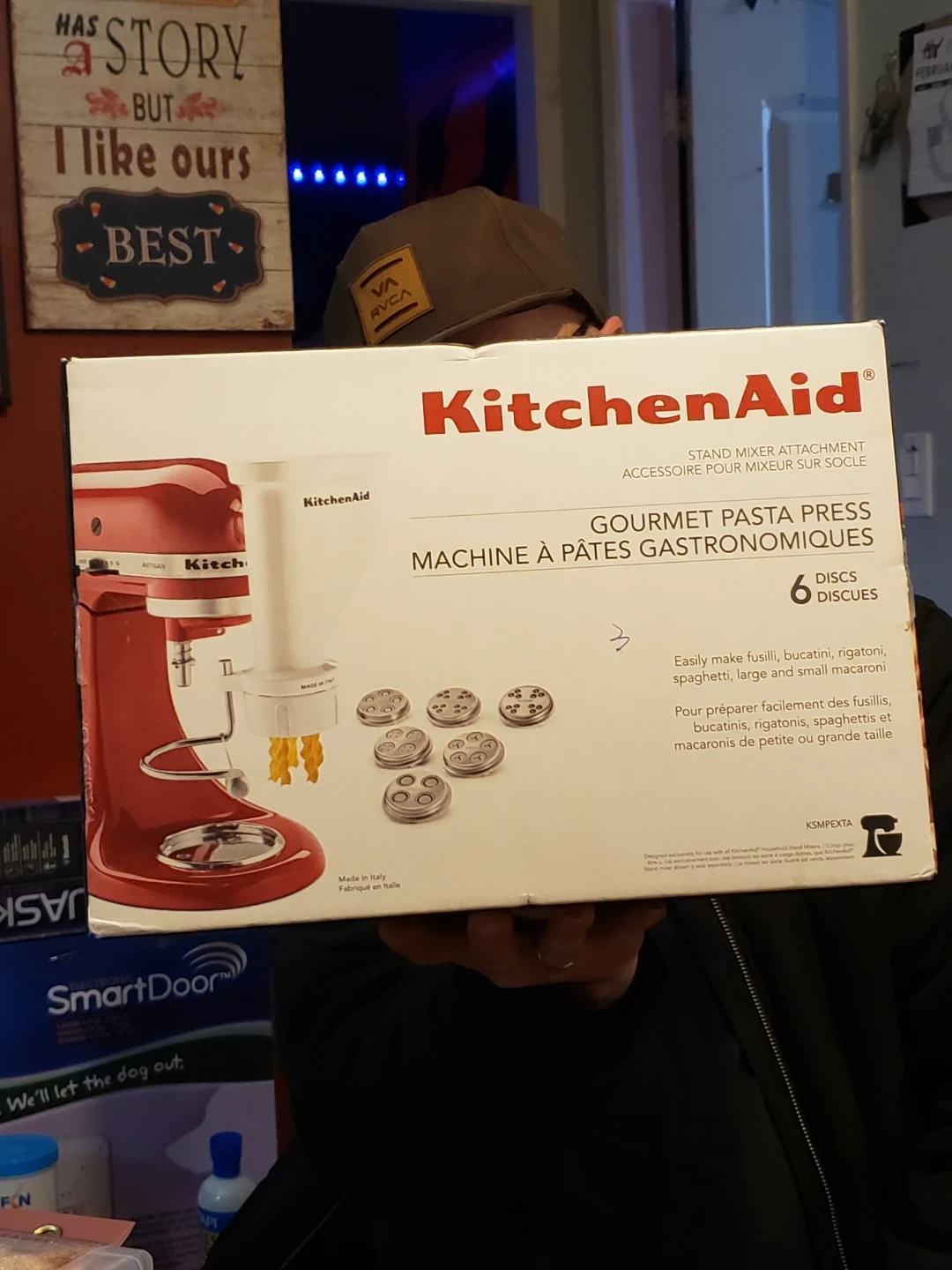 This KitchenAid attachment is for making gourmet pasta. It easily makes fusilli, bucatini, rigatoni, spaghetti, and large or small macaroni. Includes 6 discs.