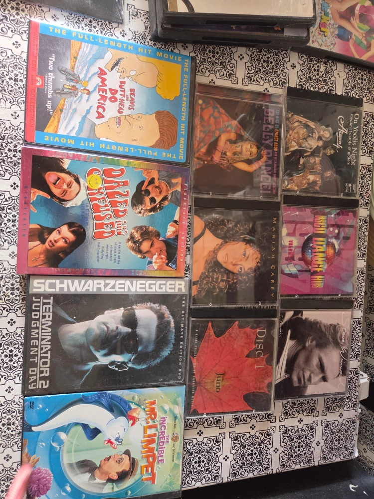 Selling a collection of DVDs, including titles like Beavis and Butt-Head Do America, Dazed and Confused, Terminator 2: Judgment Day, The Incredible Mr. Limpet, Mariah Carey albums, and more! A great mix of movies and music for your collection