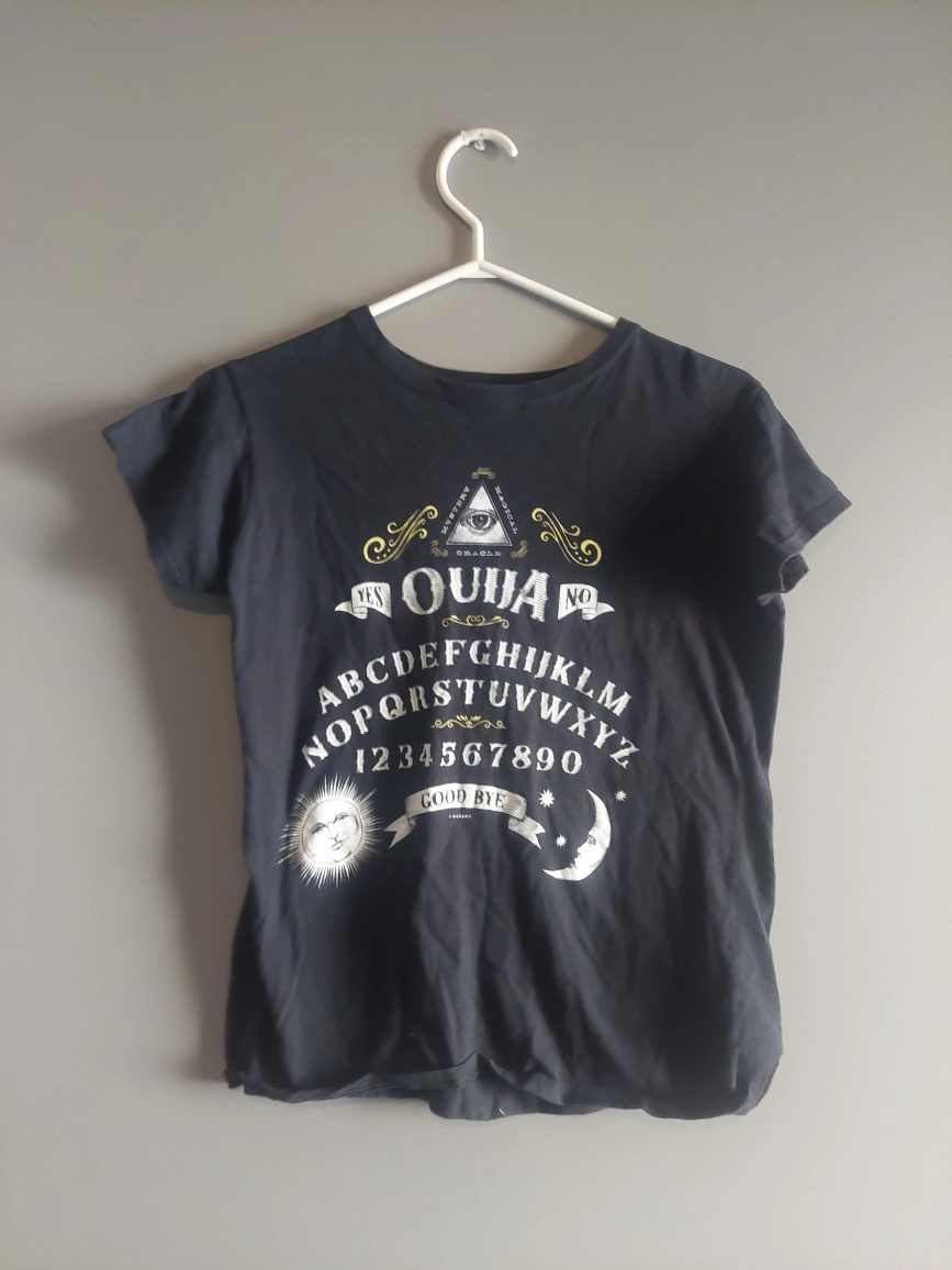 Selling a black t-shirt with a cool Ouija board graphic on the front! It features the alphabet, numbers, and a sun and moon design. The shirt is in good condition and ready for a new home
