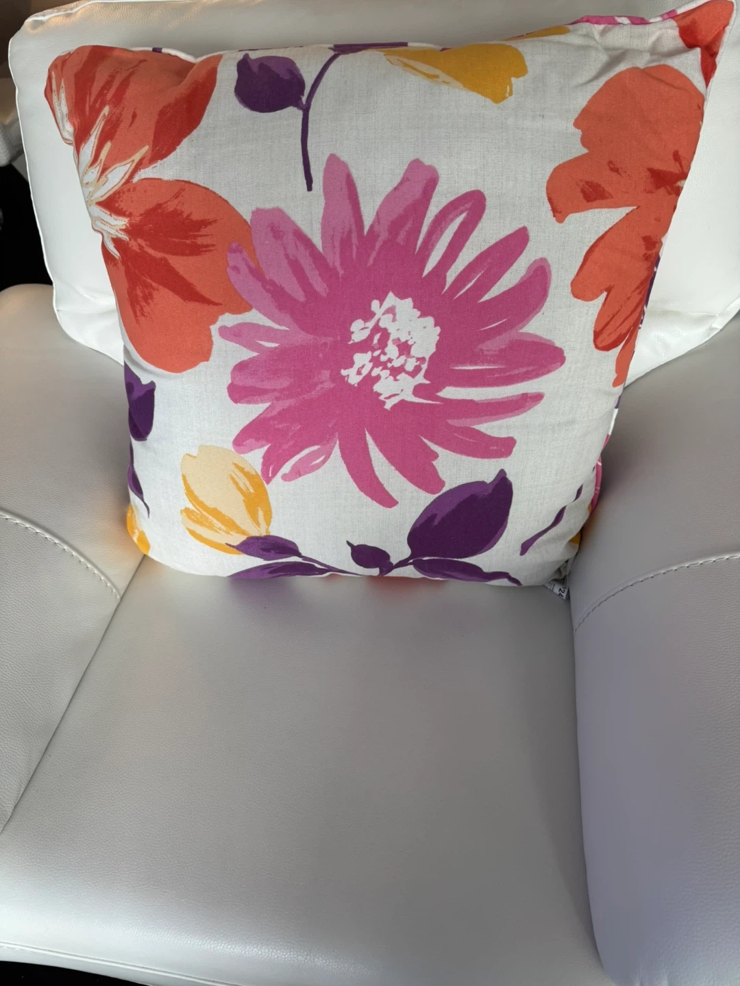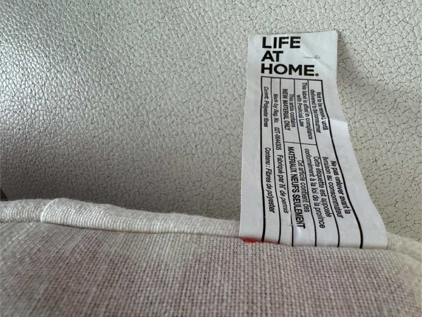 Shell is 51% polyester / 49% cotton, with 100% polyester filling. Size: 22 inches by 22 inches. Perfect for brightening up any couch, chair, or bedroom. This is new . Pick up location : close to Steeles and Buthurst intersection . From pet free, smole free home.
