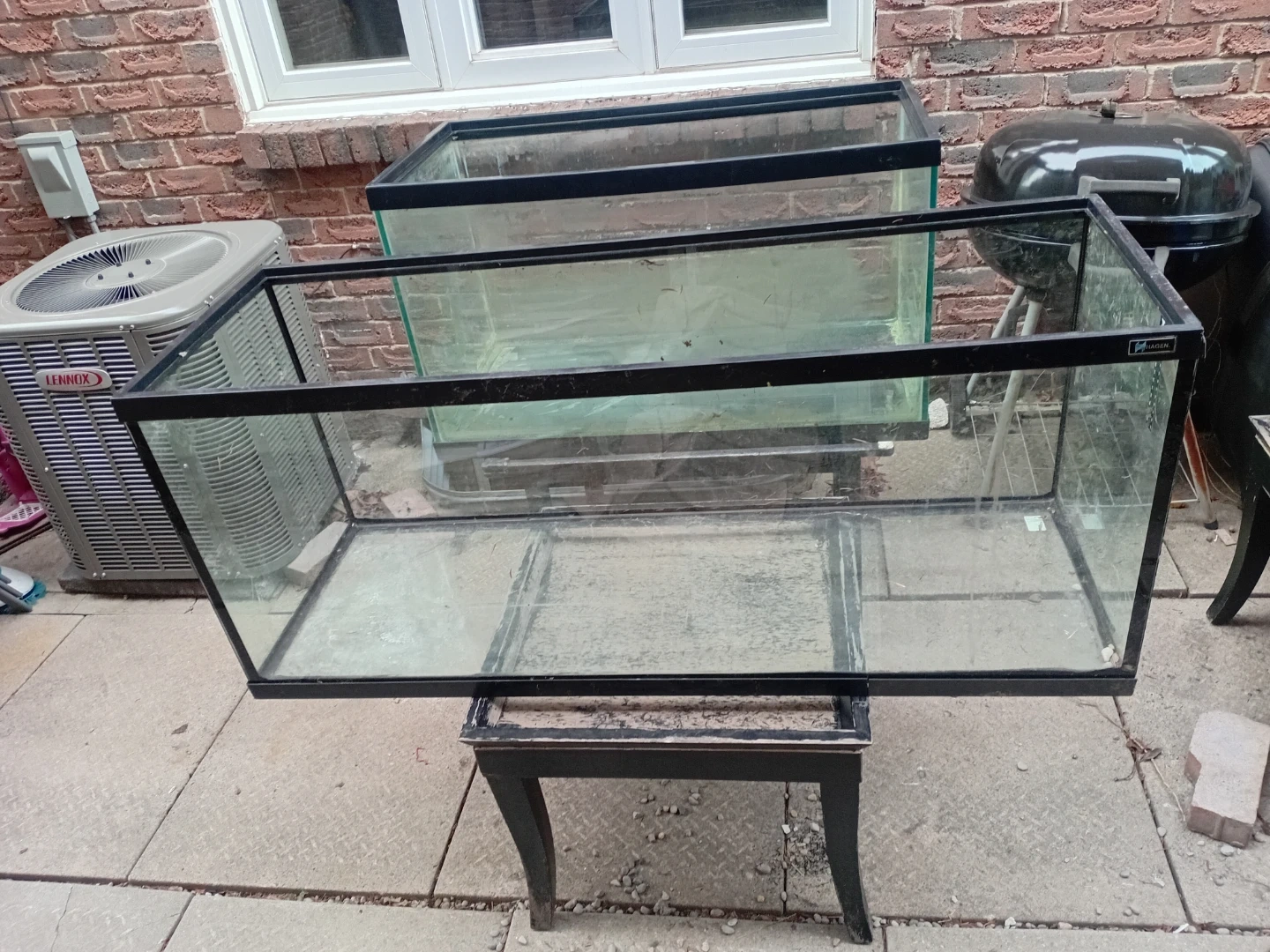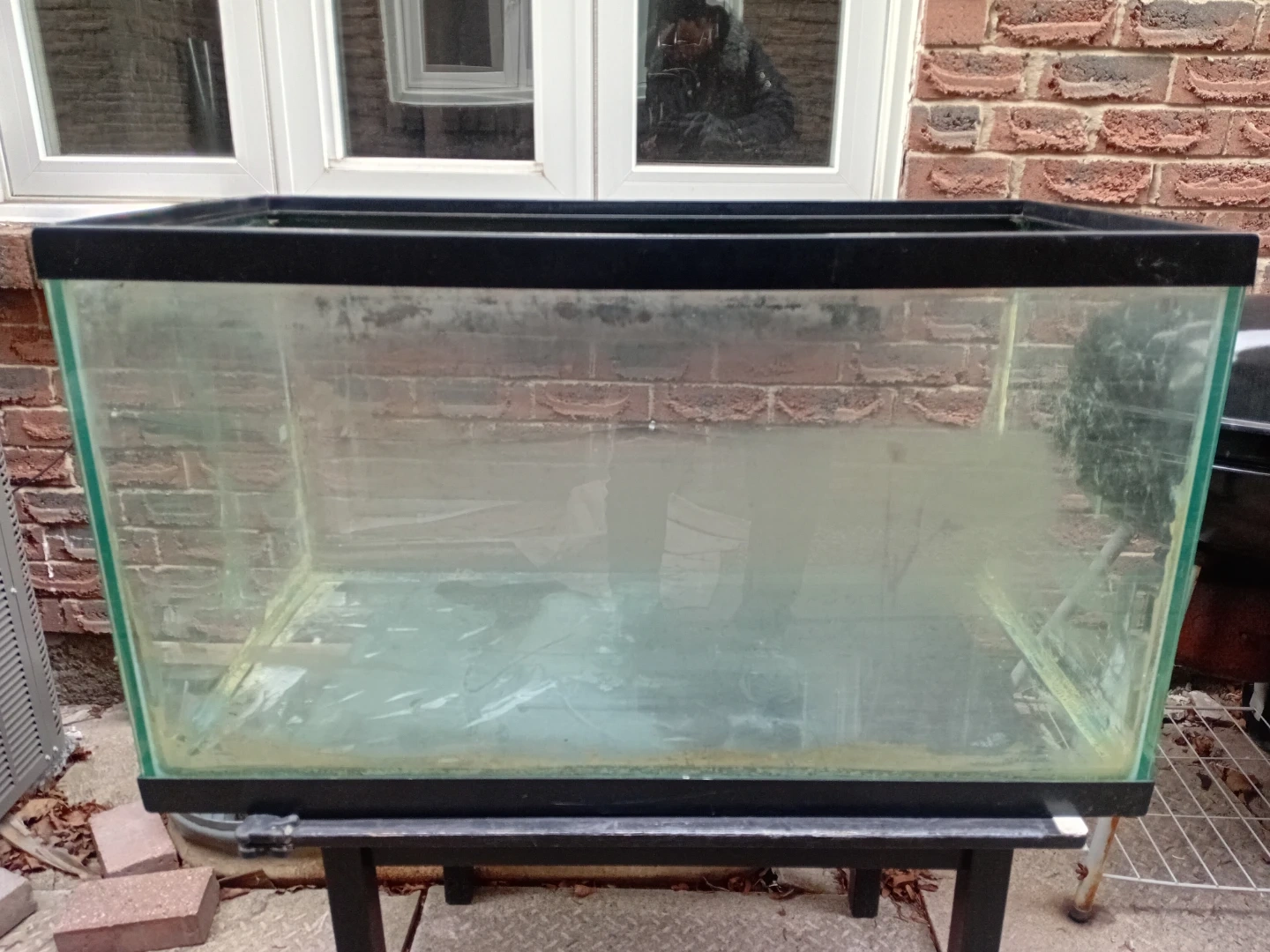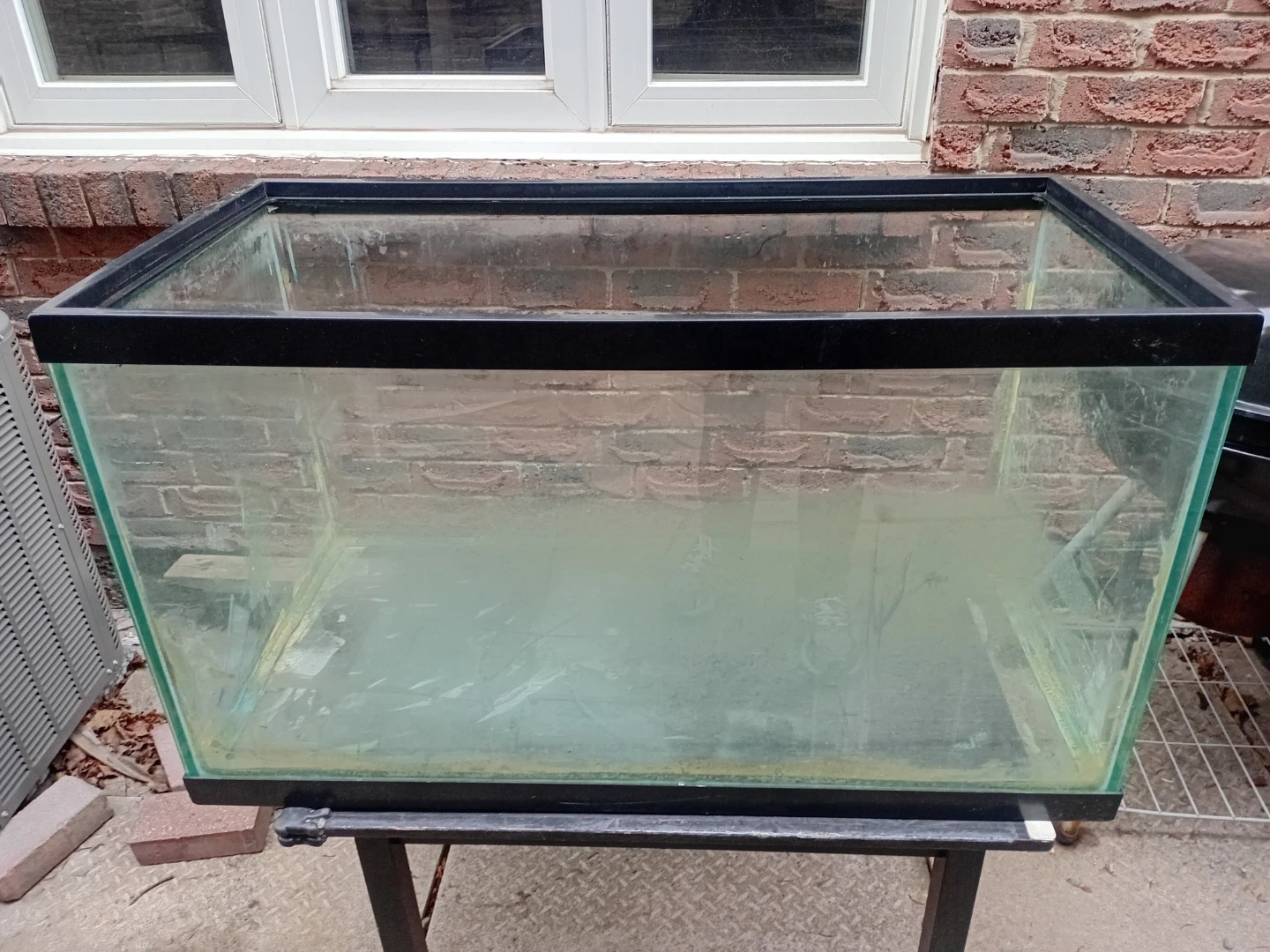 This is a large glass aquarium tank. It's made of glass with a black plastic trim. It's 48 inches legth 20 inches width And 36 inches Legth 21 inches Width empty and ready for a new home. This tank would be great for a variety of fish or other aquatic pets!