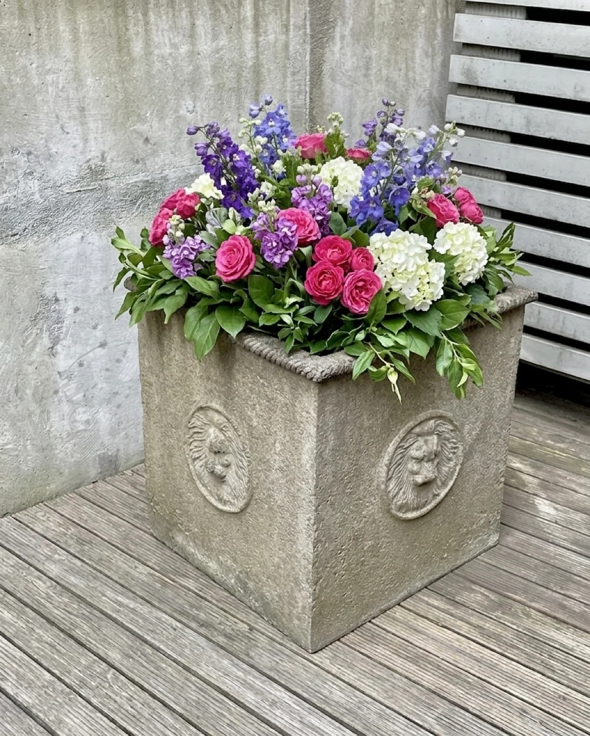 Two stone square planters, each featuring a decorative lion emblem. Perfect for adding a touch of classic elegance to your garden or patio. These planters measure approximately 16 inches on each side.