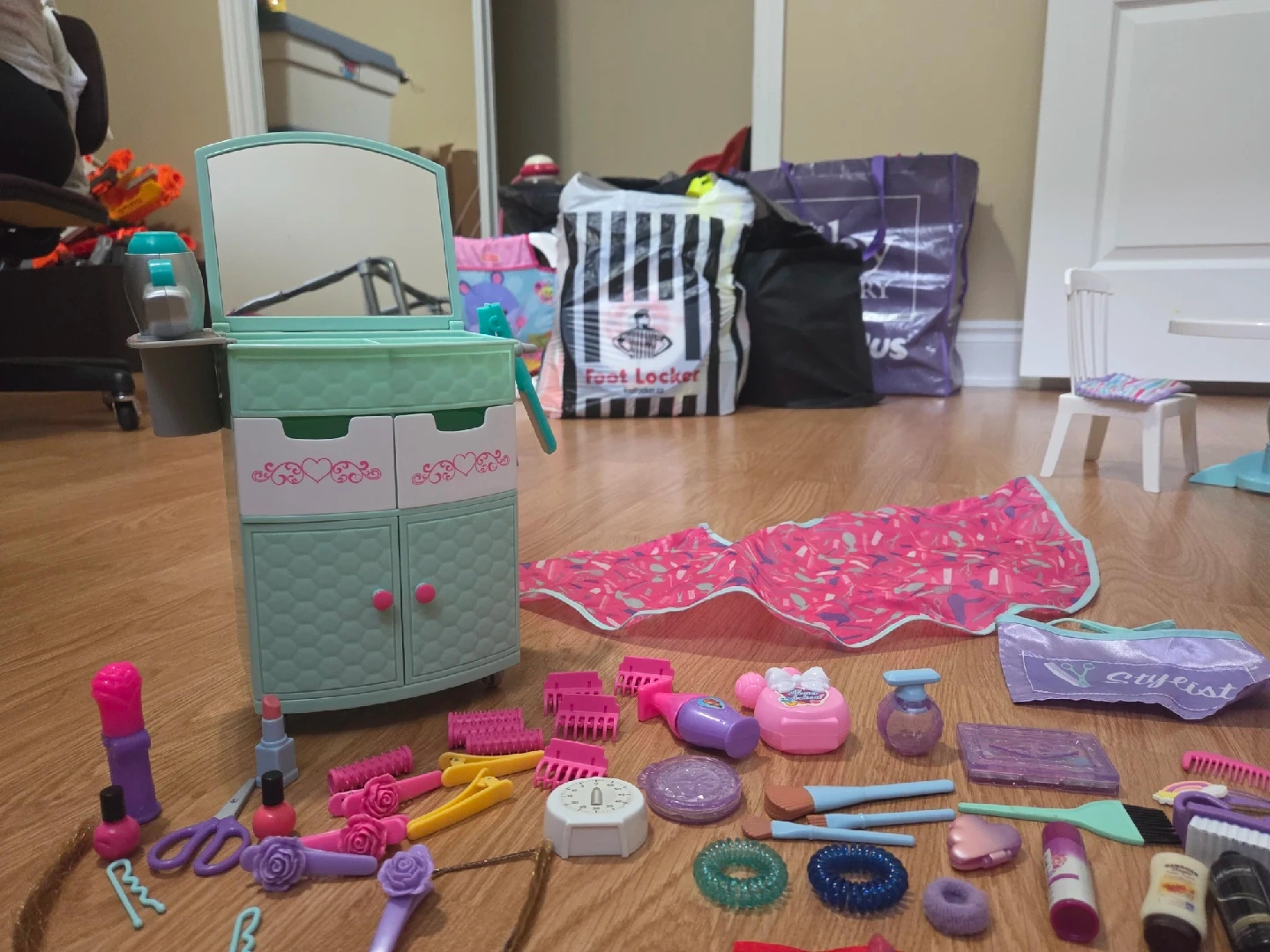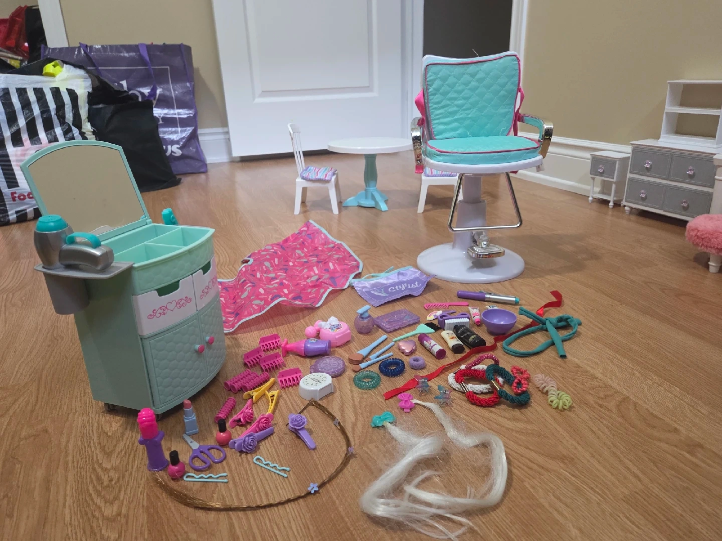 87Selling a complete Our Generation doll hair salon set! It comes with everything you see in the pictures, including the salon chair, styling station, cape, and tons of accessories for hours of fun. Perfect for creative play!