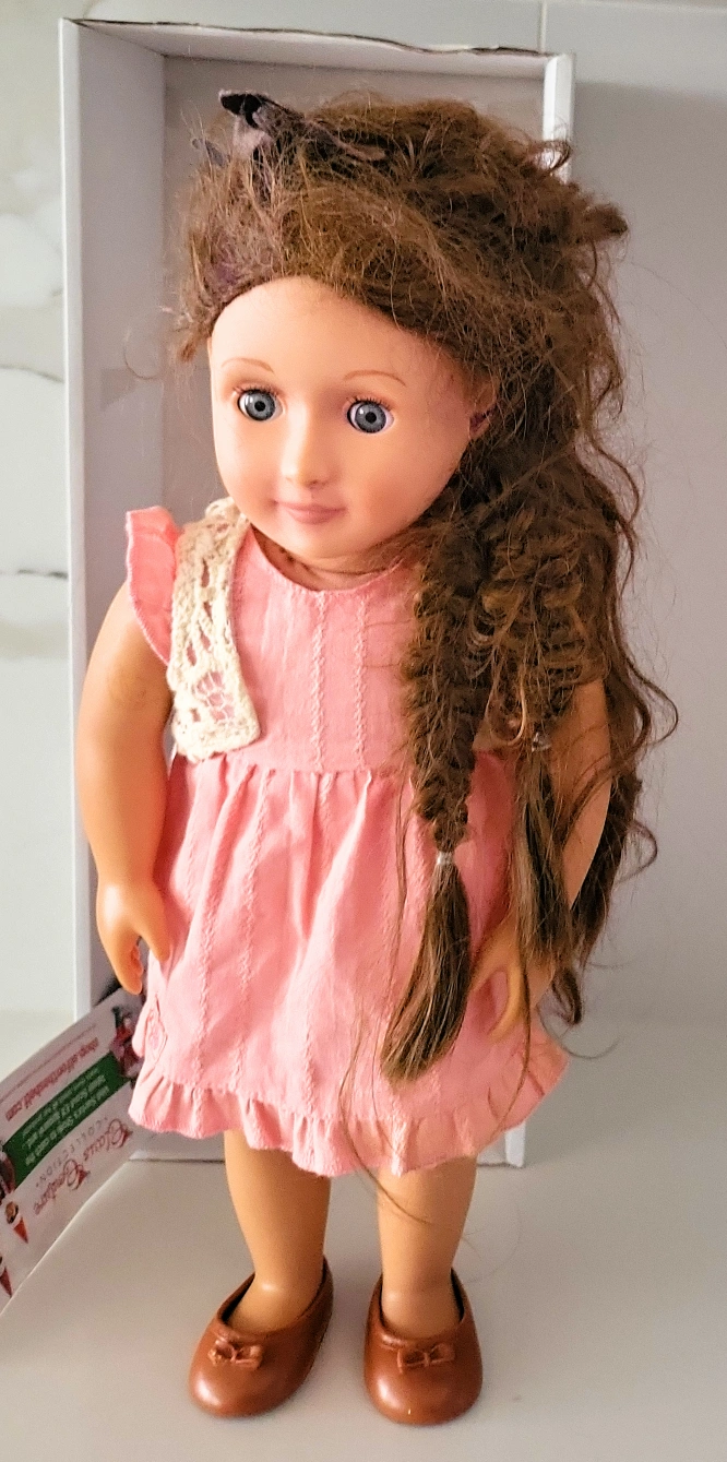 Selling an Our Generation doll! She comes with a cute pink dress, a little crochet vest, and brown shoes. She's in good condition and ready for a new home. The original box is included too!